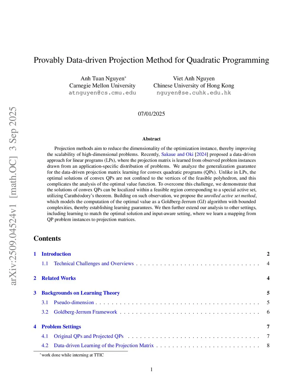 Projection methods aim to reduce the dimensionality of the optimization instance, thereby improving the scalability of high-dimensional problems. Recently, Sakaue and Oki proposed a data-driven approach for linear programs (LPs), where the projection matrix is learned from observed problem instances drawn from an application-specific distribution of problems. We analyze the generalization guarantee for the data-driven projection matrix learning for convex quadratic programs (QPs). Unlike in LPs, the optimal solutions of convex QPs are not confined to the vertices of the feasible polyhedron, and this complicates the analysis of the optimal value function. To overcome this challenge, we demonstrate that the solutions of convex QPs can be localized within a feasible region corresponding to a special active set, utilizing Caratheodory's theorem. Building on such observation, we propose the unrolled active set method, which models the computation of the optimal value as a Goldberg-Jerrum (GJ) algorithm with bounded complexities, thereby establishing learning guarantees. We then further extend our analysis to other settings, including learning to match the optimal solution and input-aware setting, where we learn a mapping from QP problem instances to projection matrices.