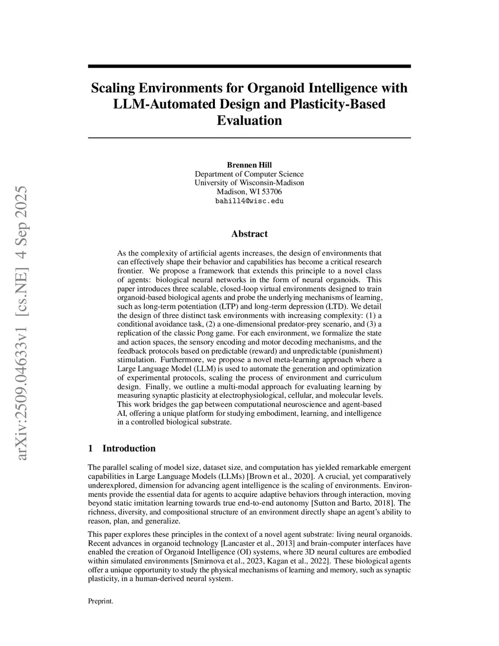 The capacity of an embodied agent to understand, predict, and interact with its environment is fundamentally contingent on an internal world model. This paper introduces a novel framework for investigating the formation and adaptation of such world models within a biological substrate: human neural organoids. We present a curriculum of three scalable, closed-loop virtual environments designed to train these biological agents and probe the underlying synaptic mechanisms of learning, such as long-term potentiation (LTP) and long-term depression (LTD). We detail the design of three distinct task environments that demand progressively more sophisticated world models for successful decision-making: (1) a conditional avoidance task for learning static state-action contingencies, (2) a one-dimensional predator-prey scenario for goal-directed interaction, and (3) a replication of the classic Pong game for modeling dynamic, continuous-time systems. For each environment, we formalize the state and action spaces, the sensory encoding and motor decoding mechanisms, and the feedback protocols based on predictable (reward) and unpredictable (punishment) stimulation, which serve to drive model refinement. In a significant methodological advance, we propose a meta-learning approach where a Large Language Model automates the generative design and optimization of experimental protocols, thereby scaling the process of environment and curriculum design. Finally, we outline a multi-modal evaluation strategy that moves beyond task performance to directly measure the physical correlates of the learned world model by quantifying synaptic plasticity at electrophysiological, cellular, and molecular levels. This work bridges the gap between model-based reinforcement learning and computational neuroscience, offering a unique platform for studying embodiment, decision-making, and the physical basis of intelligence.