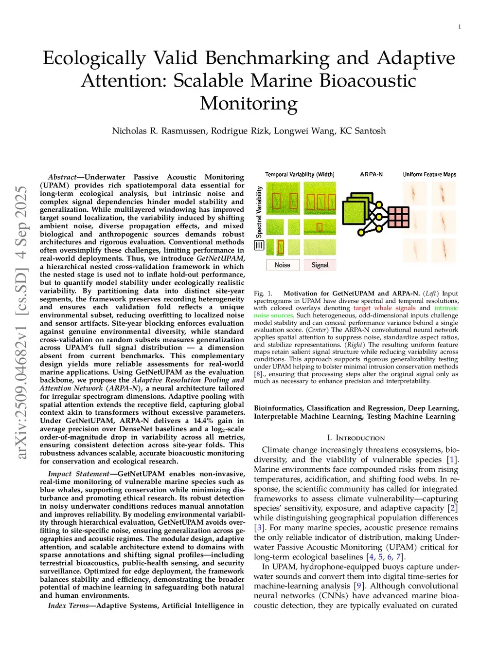 Underwater Passive Acoustic Monitoring (UPAM) provides rich spatiotemporal data for long-term ecological analysis, but intrinsic noise and complex signal dependencies hinder model stability and generalization. Multilayered windowing has improved target sound localization, yet variability from shifting ambient noise, diverse propagation effects, and mixed biological and anthropogenic sources demands robust architectures and rigorous evaluation. We introduce GetNetUPAM, a hierarchical nested cross-validation framework designed to quantify model stability under ecologically realistic variability. Data are partitioned into distinct site-year segments, preserving recording heterogeneity and ensuring each validation fold reflects a unique environmental subset, reducing overfitting to localized noise and sensor artifacts. Site-year blocking enforces evaluation against genuine environmental diversity, while standard cross-validation on random subsets measures generalization across UPAM's full signal distribution, a dimension absent from current benchmarks. Using GetNetUPAM as the evaluation backbone, we propose the Adaptive Resolution Pooling and Attention Network (ARPA-N), a neural architecture for irregular spectrogram dimensions. Adaptive pooling with spatial attention extends the receptive field, capturing global context without excessive parameters. Under GetNetUPAM, ARPA-N achieves a 14.4% gain in average precision over DenseNet baselines and a log2-scale order-of-magnitude drop in variability across all metrics, enabling consistent detection across site-year folds and advancing scalable, accurate bioacoustic monitoring.