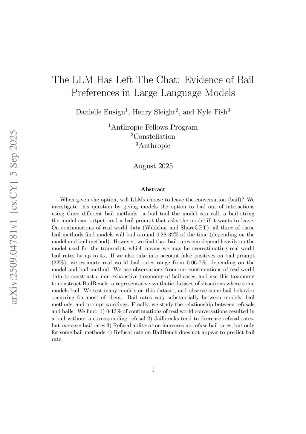 When given the option, will LLMs choose to leave the conversation (bail)? We investigate this question by giving models the option to bail out of interactions using three different bail methods: a bail tool the model can call, a bail string the model can output, and a bail prompt that asks the model if it wants to leave. On continuations of real world data (Wildchat and ShareGPT), all three of these bail methods find models will bail around 0.28-32\% of the time (depending on the model and bail method). However, we find that bail rates can depend heavily on the model used for the transcript, which means we may be overestimating real world bail rates by up to 4x. If we also take into account false positives on bail prompt (22\%), we estimate real world bail rates range from 0.06-7\%, depending on the model and bail method. We use observations from our continuations of real world data to construct a non-exhaustive taxonomy of bail cases, and use this taxonomy to construct BailBench: a representative synthetic dataset of situations where some models bail. We test many models on this dataset, and observe some bail behavior occurring for most of them. Bail rates vary substantially between models, bail methods, and prompt wordings. Finally, we study the relationship between refusals and bails. We find: 1) 0-13\% of continuations of real world conversations resulted in a bail without a corresponding refusal 2) Jailbreaks tend to decrease refusal rates, but increase bail rates 3) Refusal abliteration increases no-refuse bail rates, but only for some bail methods 4) Refusal rate on BailBench does not appear to predict bail rate.
