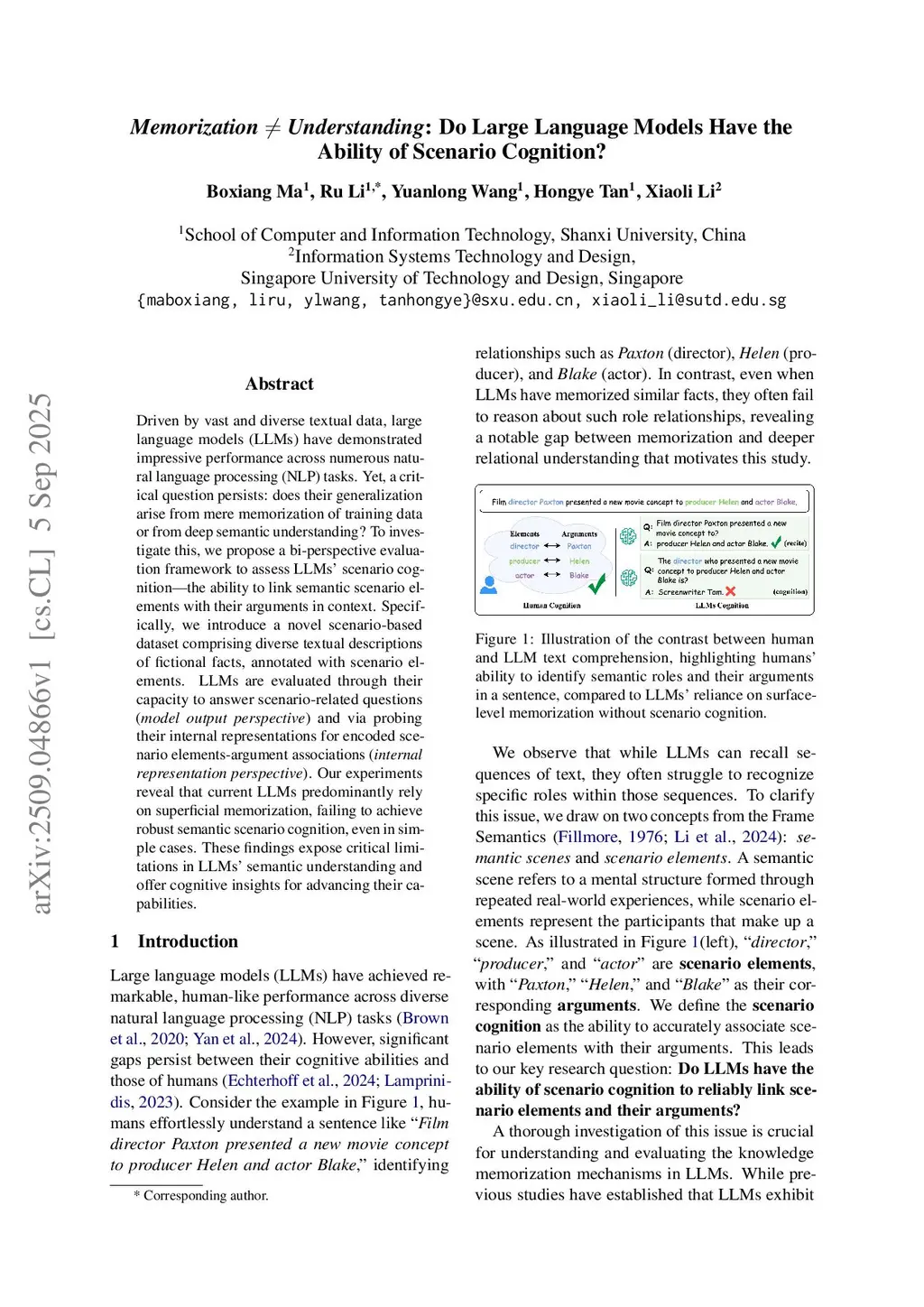 Driven by vast and diverse textual data, large language models (LLMs) have demonstrated impressive performance across numerous natural language processing (NLP) tasks. Yet, a critical question persists: does their generalization arise from mere memorization of training data or from deep semantic understanding? To investigate this, we propose a bi-perspective evaluation framework to assess LLMs' scenario cognition - the ability to link semantic scenario elements with their arguments in context. Specifically, we introduce a novel scenario-based dataset comprising diverse textual descriptions of fictional facts, annotated with scenario elements. LLMs are evaluated through their capacity to answer scenario-related questions (model output perspective) and via probing their internal representations for encoded scenario elements-argument associations (internal representation perspective). Our experiments reveal that current LLMs predominantly rely on superficial memorization, failing to achieve robust semantic scenario cognition, even in simple cases. These findings expose critical limitations in LLMs' semantic understanding and offer cognitive insights for advancing their capabilities.