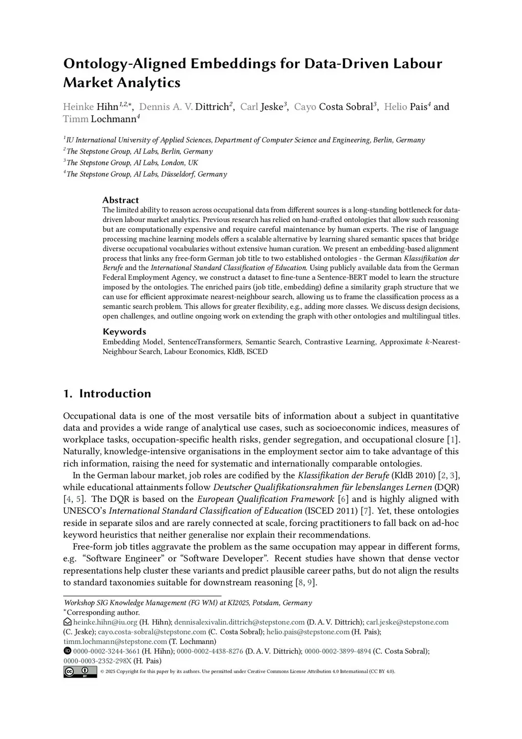 The limited ability to reason across occupational data from different sources is a long-standing bottleneck for data-driven labour market analytics. Previous research has relied on hand-crafted ontologies that allow such reasoning but are computationally expensive and require careful maintenance by human experts. The rise of language processing machine learning models offers a scalable alternative by learning shared semantic spaces that bridge diverse occupational vocabularies without extensive human curation. We present an embedding-based alignment process that links any free-form German job title to two established ontologies - the German Klassifikation der Berufe and the International Standard Classification of Education. Using publicly available data from the German Federal Employment Agency, we construct a dataset to fine-tune a Sentence-BERT model to learn the structure imposed by the ontologies. The enriched pairs (job title, embedding) define a similarity graph structure that we can use for efficient approximate nearest-neighbour search, allowing us to frame the classification process as a semantic search problem. This allows for greater flexibility, e.g., adding more classes. We discuss design decisions, open challenges, and outline ongoing work on extending the graph with other ontologies and multilingual titles.