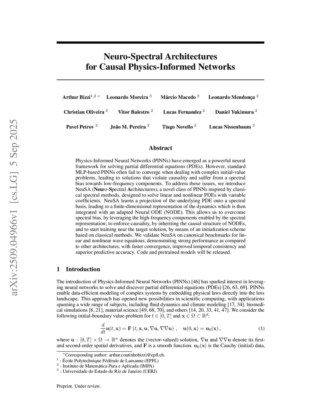 Physics-Informed Neural Networks (PINNs) have emerged as a powerful framework for solving partial differential equations (PDEs). However, standard MLP-based PINNs often fail to converge when dealing with complex initial value problems, leading to solutions that violate causality and suffer from a spectral bias towards low-frequency components. To address these issues, we introduce NeuSA (Neuro-Spectral Architectures), a novel class of PINNs inspired by classical spectral methods, designed to solve linear and nonlinear PDEs with variable coefficients. NeuSA learns a projection of the underlying PDE onto a spectral basis, leading to a finite-dimensional representation of the dynamics which is then integrated with an adapted Neural ODE (NODE). This allows us to overcome spectral bias, by leveraging the high-frequency components enabled by the spectral representation; to enforce causality, by inheriting the causal structure of NODEs, and to start training near the target solution, by means of an initialization scheme based on classical methods. We validate NeuSA on canonical benchmarks for linear and nonlinear wave equations, demonstrating strong performance as compared to other architectures, with faster convergence, improved temporal consistency and superior predictive accuracy. Code and pretrained models are available inthis https URL.