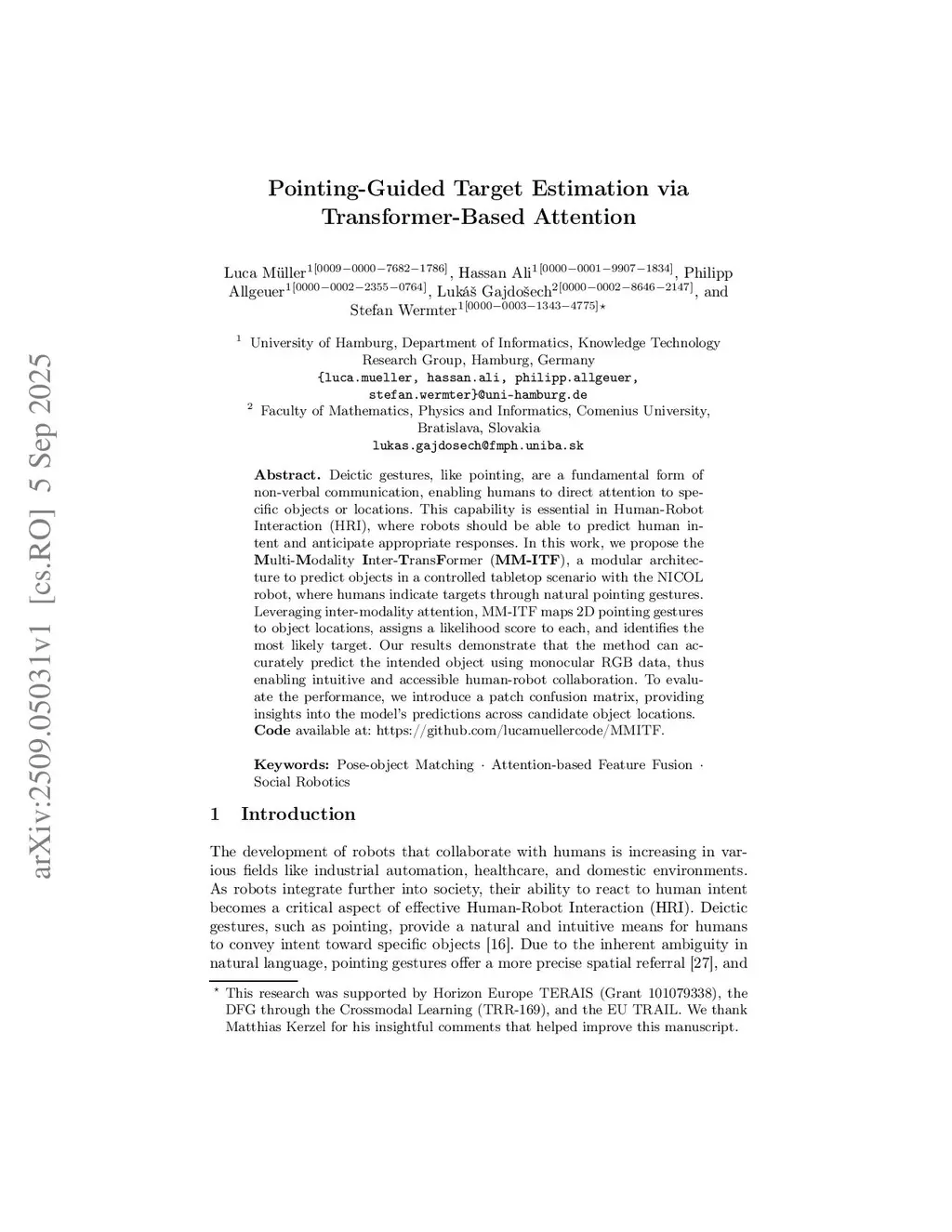 Deictic gestures, like pointing, are a fundamental form of non-verbal communication, enabling humans to direct attention to specific objects or locations. This capability is essential in Human-Robot Interaction (HRI), where robots should be able to predict human intent and anticipate appropriate responses. In this work, we propose the Multi-Modality Inter-TransFormer (MM-ITF), a modular architecture to predict objects in a controlled tabletop scenario with the NICOL robot, where humans indicate targets through natural pointing gestures. Leveraging inter-modality attention, MM-ITF maps 2D pointing gestures to object locations, assigns a likelihood score to each, and identifies the most likely target. Our results demonstrate that the method can accurately predict the intended object using monocular RGB data, thus enabling intuitive and accessible human-robot collaboration. To evaluate the performance, we introduce a patch confusion matrix, providing insights into the model's predictions across candidate object locations. Code available at:this https URL.