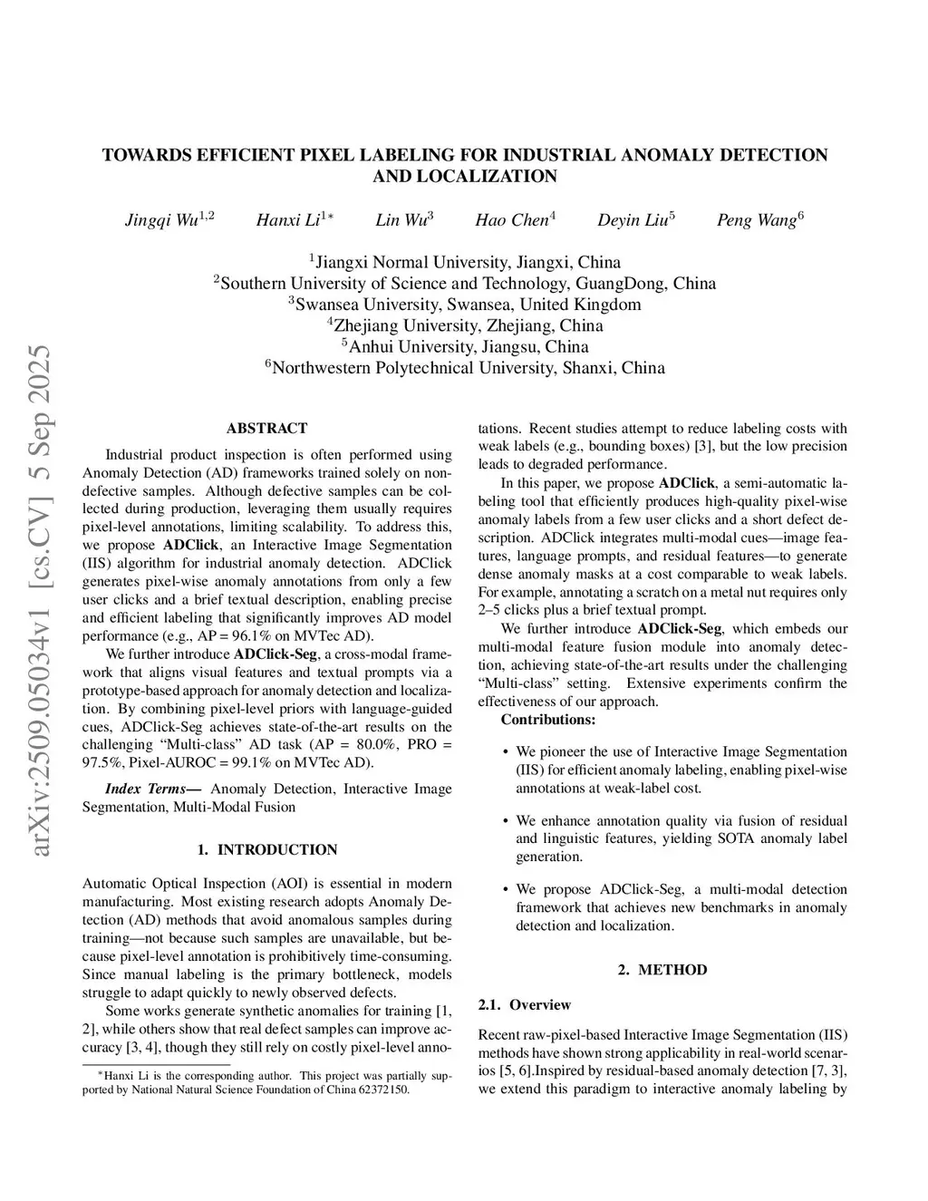 Industrial product inspection is often performed using Anomaly Detection (AD) frameworks trained solely on non-defective samples. Although defective samples can be collected during production, leveraging them usually requires pixel-level annotations, limiting scalability. To address this, we propose ADClick, an Interactive Image Segmentation (IIS) algorithm for industrial anomaly detection. ADClick generates pixel-wise anomaly annotations from only a few user clicks and a brief textual description, enabling precise and efficient labeling that significantly improves AD model performance (e.g., AP = 96.1\% on MVTec AD). We further introduce ADClick-Seg, a cross-modal framework that aligns visual features and textual prompts via a prototype-based approach for anomaly detection and localization. By combining pixel-level priors with language-guided cues, ADClick-Seg achieves state-of-the-art results on the challenging ``Multi-class'' AD task (AP = 80.0\%, PRO = 97.5\%, Pixel-AUROC = 99.1\% on MVTec AD).