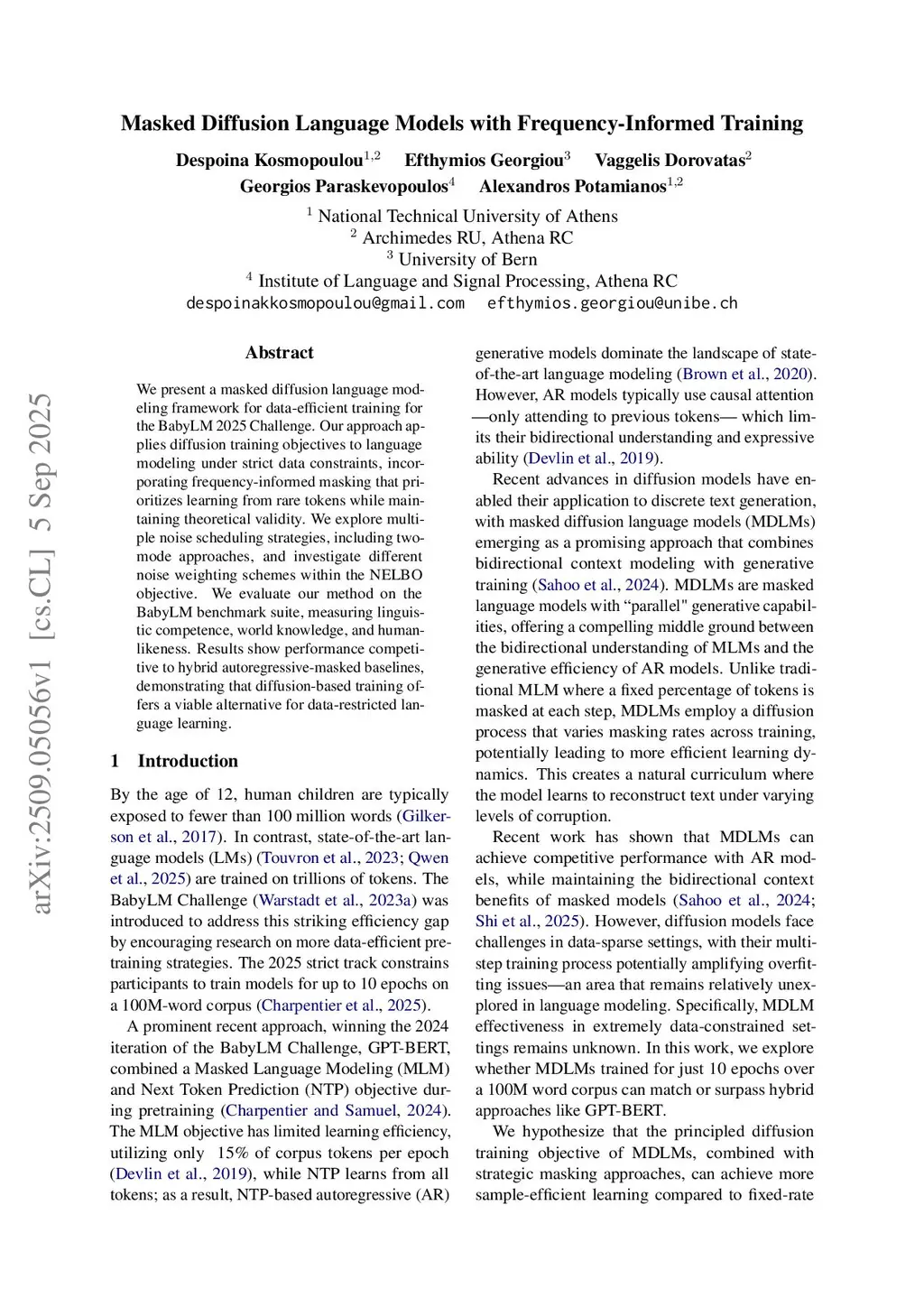 We present a masked diffusion language modeling framework for data-efficient training for the BabyLM 2025 Challenge. Our approach applies diffusion training objectives to language modeling under strict data constraints, incorporating frequency-informed masking that prioritizes learning from rare tokens while maintaining theoretical validity. We explore multiple noise scheduling strategies, including two-mode approaches, and investigate different noise weighting schemes within the NELBO objective. We evaluate our method on the BabyLM benchmark suite, measuring linguistic competence, world knowledge, and human-likeness. Results show performance competitive to hybrid autoregressive-masked baselines, demonstrating that diffusion-based training offers a viable alternative for data-restricted language learning.