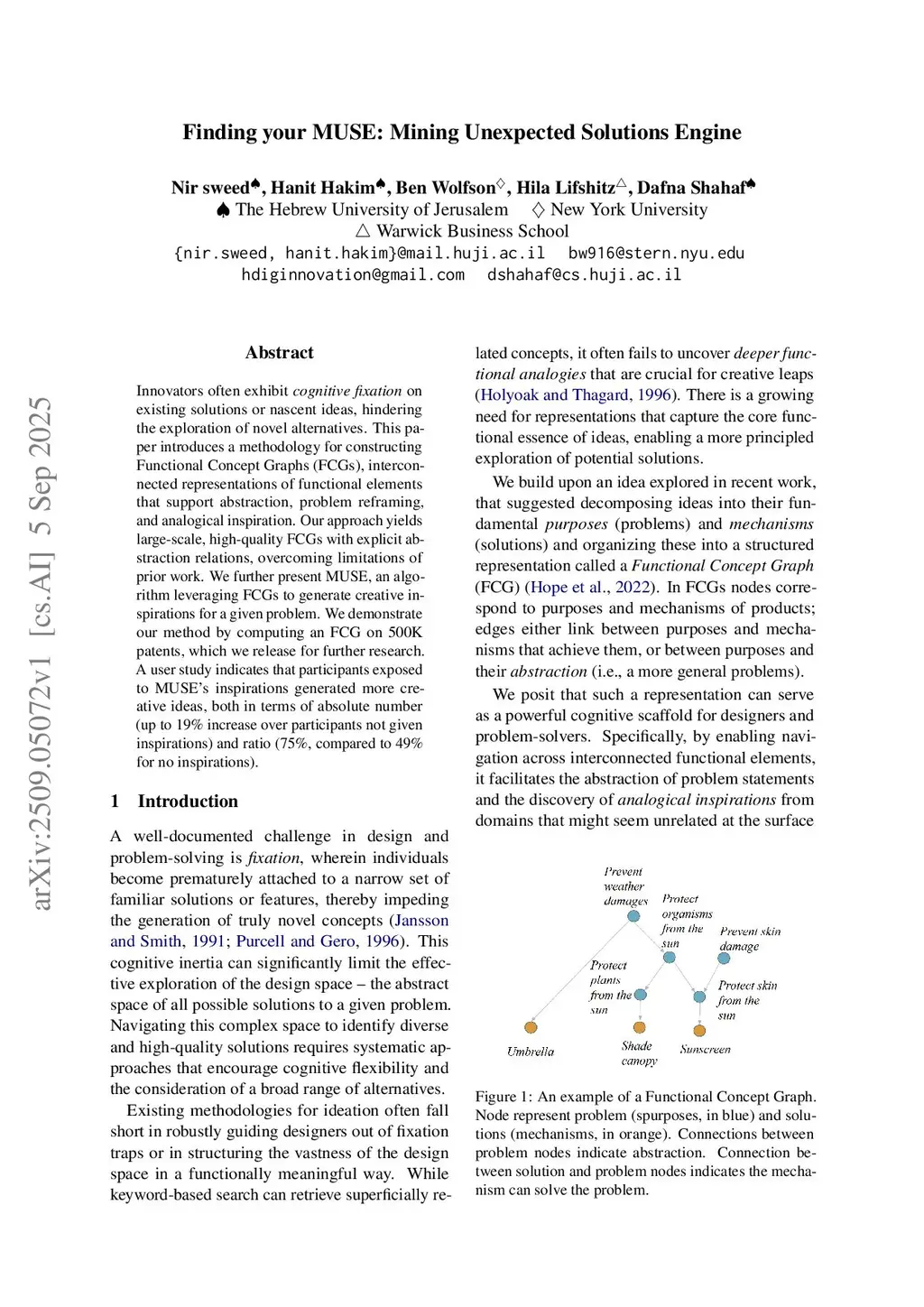 Innovators often exhibit cognitive fixation on existing solutions or nascent ideas, hindering the exploration of novel alternatives. This paper introduces a methodology for constructing Functional Concept Graphs (FCGs), interconnected representations of functional elements that support abstraction, problem reframing, and analogical inspiration. Our approach yields large-scale, high-quality FCGs with explicit abstraction relations, overcoming limitations of prior work. We further present MUSE, an algorithm leveraging FCGs to generate creative inspirations for a given problem. We demonstrate our method by computing an FCG on 500K patents, which we release for further research.