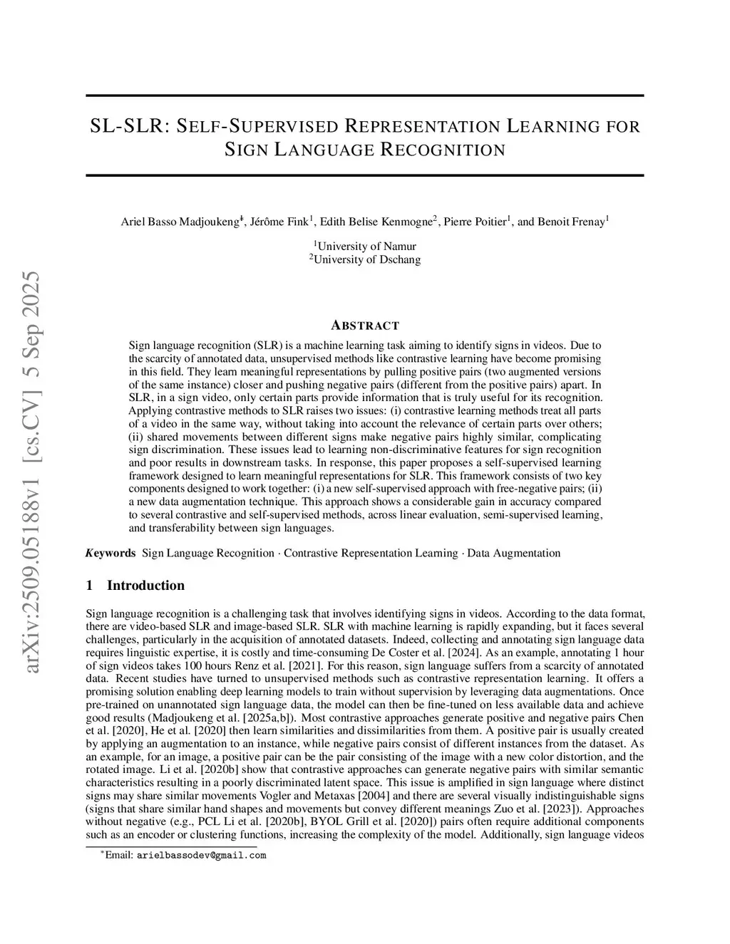 Sign language recognition (SLR) is a machine learning task aiming to identify signs in videos. Due to the scarcity of annotated data, unsupervised methods like contrastive learning have become promising in this field. They learn meaningful representations by pulling positive pairs (two augmented versions of the same instance) closer and pushing negative pairs (different from the positive pairs) apart. In SLR, in a sign video, only certain parts provide information that is truly useful for its recognition. Applying contrastive methods to SLR raises two issues: (i) contrastive learning methods treat all parts of a video in the same way, without taking into account the relevance of certain parts over others; (ii) shared movements between different signs make negative pairs highly similar, complicating sign discrimination. These issues lead to learning non-discriminative features for sign recognition and poor results in downstream tasks. In response, this paper proposes a self-supervised learning framework designed to learn meaningful representations for SLR. This framework consists of two key components designed to work together: (i) a new self-supervised approach with free-negative pairs; (ii) a new data augmentation technique. This approach shows a considerable gain in accuracy compared to several contrastive and self-supervised methods, across linear evaluation, semi-supervised learning, and transferability between sign languages.