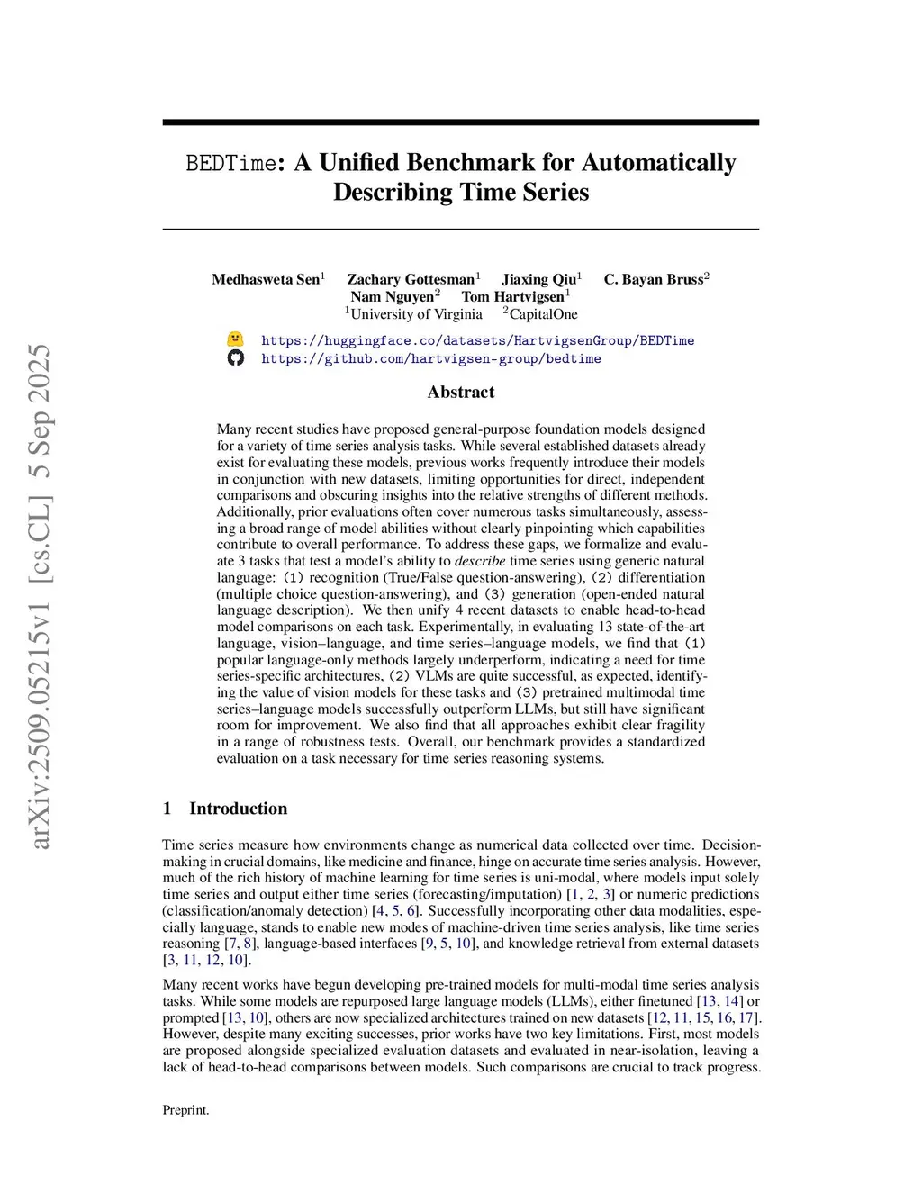BEDTime: A Unified Benchmark for Automatically Describing Time Series