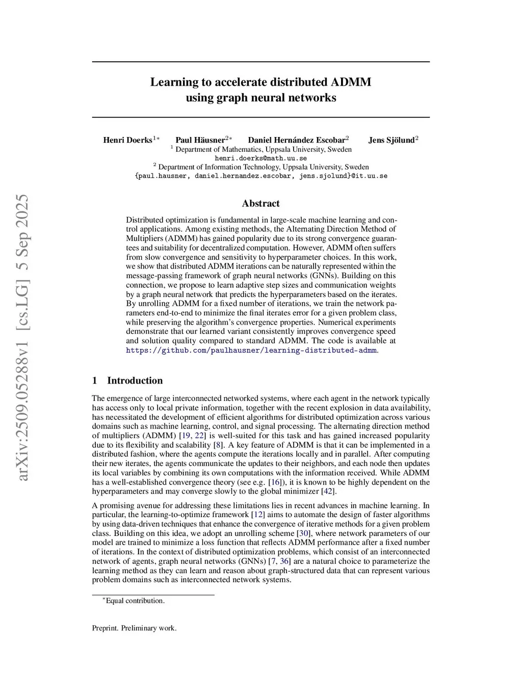 Distributed optimization is fundamental in large-scale machine learning and control applications. Among existing methods, the Alternating Direction Method of Multipliers (ADMM) has gained popularity due to its strong convergence guarantees and suitability for decentralized computation. However, ADMM often suffers from slow convergence and sensitivity to hyperparameter choices. In this work, we show that distributed ADMM iterations can be naturally represented within the message-passing framework of graph neural networks (GNNs). Building on this connection, we propose to learn adaptive step sizes and communication weights by a graph neural network that predicts the hyperparameters based on the iterates. By unrolling ADMM for a fixed number of iterations, we train the network parameters end-to-end to minimize the final iterates error for a given problem class, while preserving the algorithm's convergence properties. Numerical experiments demonstrate that our learned variant consistently improves convergence speed and solution quality compared to standard ADMM. The code is available atthis https URL.
