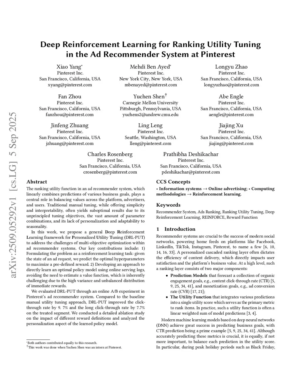 Deep Reinforcement Learning for Ranking Utility Tuning in the Ad Recommender System at Pinterest