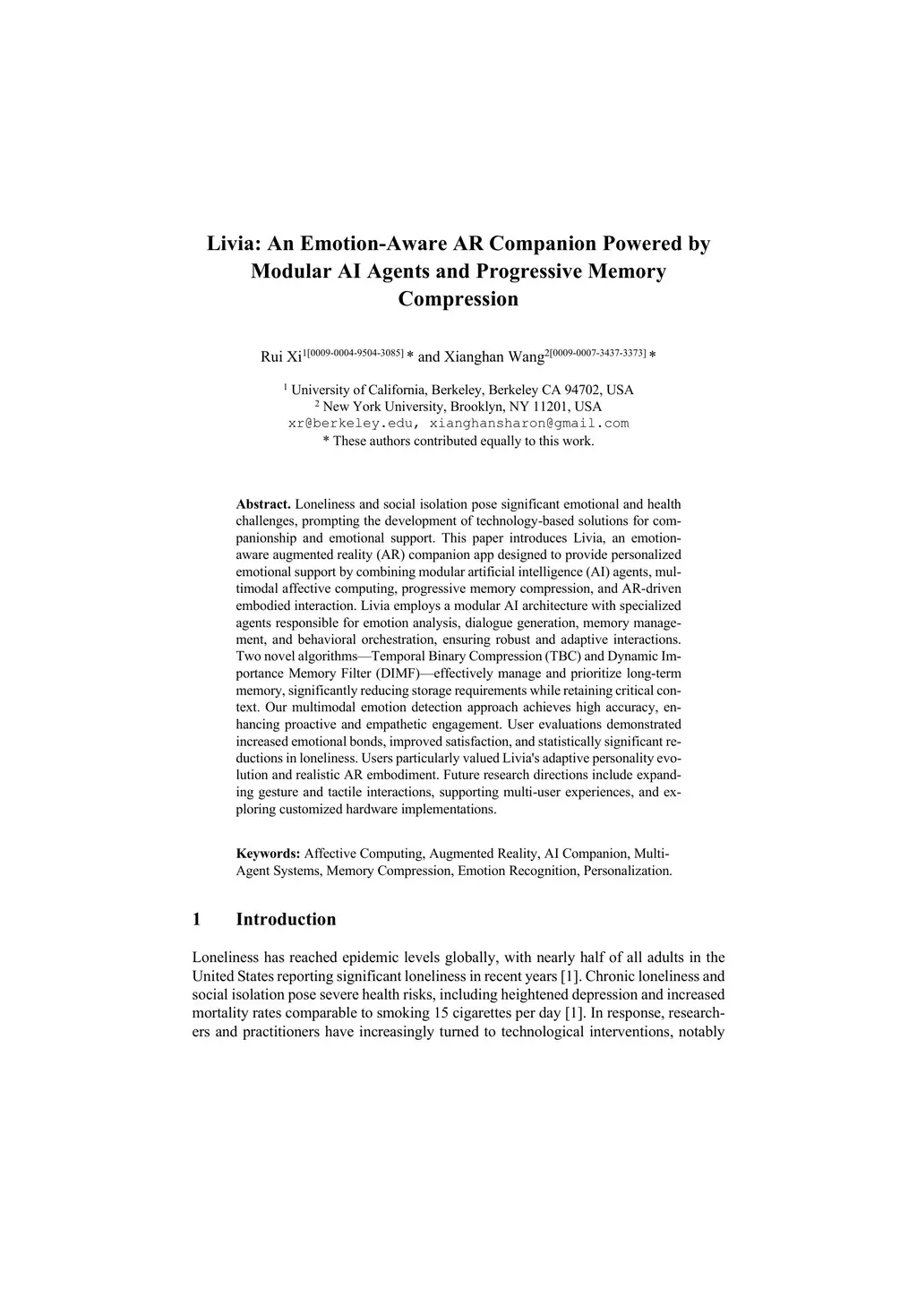 Loneliness and social isolation pose significant emotional and health challenges, prompting the development of technology-based solutions for companionship and emotional support. This paper introduces Livia, an emotion-aware augmented reality (AR) companion app designed to provide personalized emotional support by combining modular artificial intelligence (AI) agents, multimodal affective computing, progressive memory compression, and AR driven embodied interaction. Livia employs a modular AI architecture with specialized agents responsible for emotion analysis, dialogue generation, memory management, and behavioral orchestration, ensuring robust and adaptive interactions. Two novel algorithms-Temporal Binary Compression (TBC) and Dynamic Importance Memory Filter (DIMF)-effectively manage and prioritize long-term memory, significantly reducing storage requirements while retaining critical context. Our multimodal emotion detection approach achieves high accuracy, enhancing proactive and empathetic engagement. User evaluations demonstrated increased emotional bonds, improved satisfaction, and statistically significant reductions in loneliness. Users particularly valued Livia's adaptive personality evolution and realistic AR embodiment. Future research directions include expanding gesture and tactile interactions, supporting multi-user experiences, and exploring customized hardware implementations.