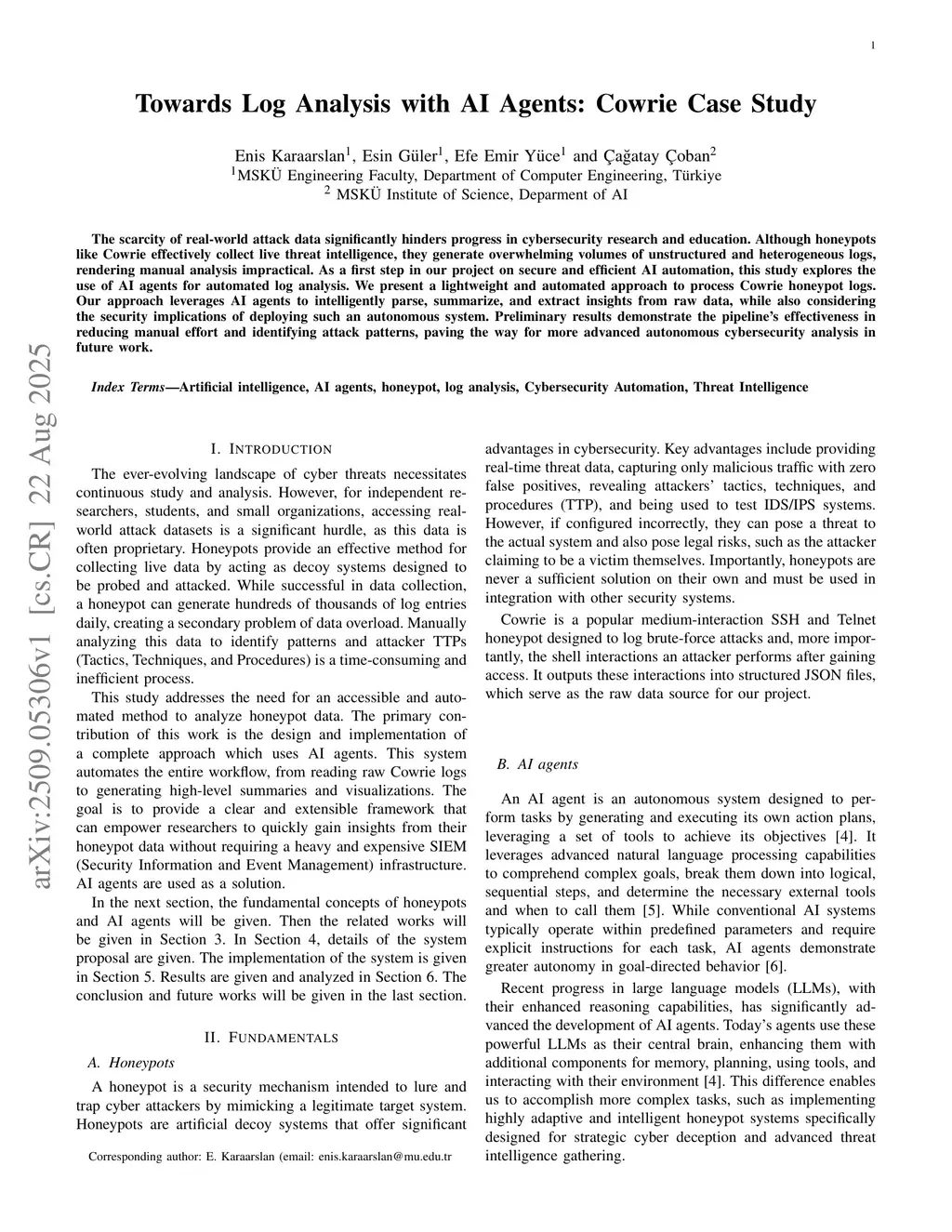 Towards Log Analysis with AI Agents: Cowrie Case Study
