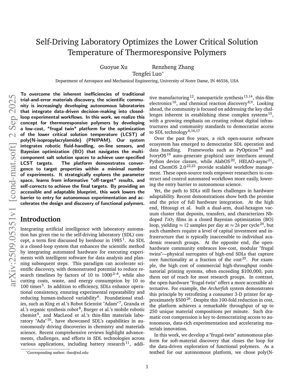 To overcome the inherent inefficiencies of traditional trial-and-error materials discovery, the scientific community is increasingly developing autonomous laboratories that integrate data-driven decision-making into closed-loop experimental workflows. In this work, we realize this concept for thermoresponsive polymers by developing a low-cost, "frugal twin" platform for the optimization of the lower critical solution temperature (LCST) of poly(N-isopropylacrylamide) (PNIPAM). Our system integrates robotic fluid-handling, on-line sensors, and Bayesian optimization (BO) that navigates the multi-component salt solution spaces to achieve user-specified LCST targets. The platform demonstrates convergence to target properties within a minimal number of experiments. It strategically explores the parameter space, learns from informative "off-target" results, and self-corrects to achieve the final targets. By providing an accessible and adaptable blueprint, this work lowers the barrier to entry for autonomous experimentation and accelerates the design and discovery of functional polymers.
