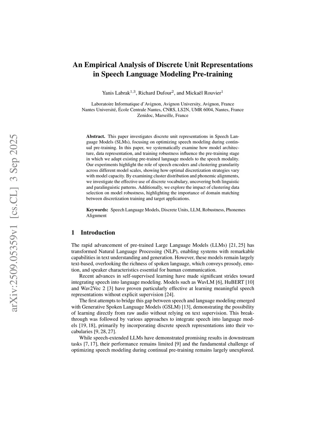 This paper investigates discrete unit representations in Speech Language Models (SLMs), focusing on optimizing speech modeling during continual pre-training. In this paper, we systematically examine how model architecture, data representation, and training robustness influence the pre-training stage in which we adapt existing pre-trained language models to the speech modality. Our experiments highlight the role of speech encoders and clustering granularity across different model scales, showing how optimal discretization strategies vary with model capacity. By examining cluster distribution and phonemic alignments, we investigate the effective use of discrete vocabulary, uncovering both linguistic and paralinguistic patterns. Additionally, we explore the impact of clustering data selection on model robustness, highlighting the importance of domain matching between discretization training and target applications.