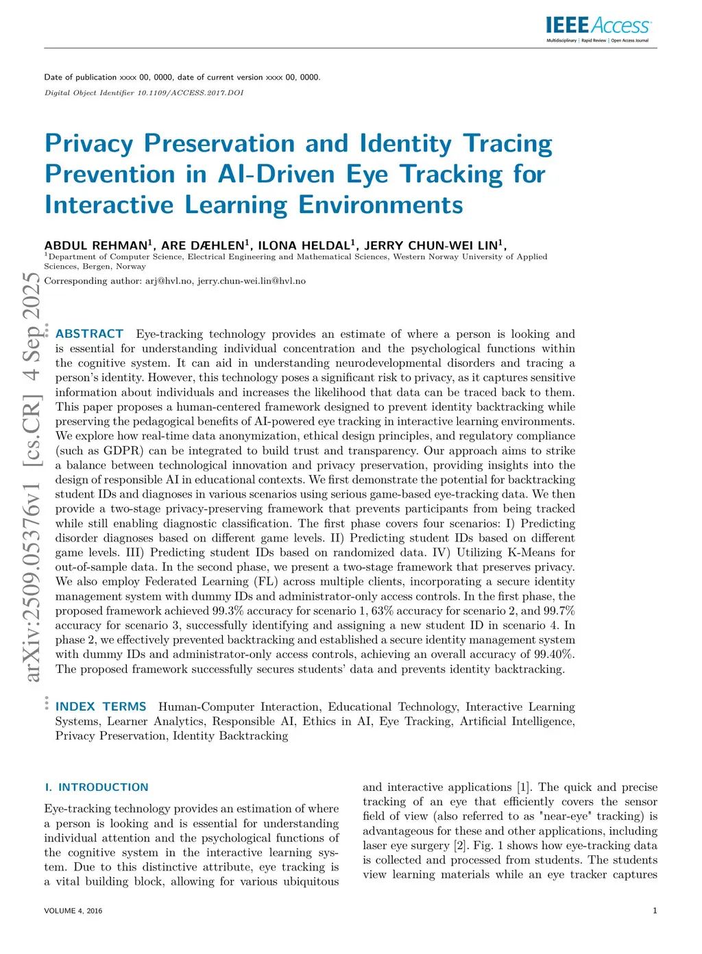 Eye-tracking technology can aid in understanding neurodevelopmental disorders and tracing a person's identity. However, this technology poses a significant risk to privacy, as it captures sensitive information about individuals and increases the likelihood that data can be traced back to them. This paper proposes a human-centered framework designed to prevent identity backtracking while preserving the pedagogical benefits of AI-powered eye tracking in interactive learning environments. We explore how real-time data anonymization, ethical design principles, and regulatory compliance (such as GDPR) can be integrated to build trust and transparency. We first demonstrate the potential for backtracking student IDs and diagnoses in various scenarios using serious game-based eye-tracking data. We then provide a two-stage privacy-preserving framework that prevents participants from being tracked while still enabling diagnostic classification. The first phase covers four scenarios: I) Predicting disorder diagnoses based on different game levels. II) Predicting student IDs based on different game levels. III) Predicting student IDs based on randomized data. IV) Utilizing K-Means for out-of-sample data. In the second phase, we present a two-stage framework that preserves privacy. We also employ Federated Learning (FL) across multiple clients, incorporating a secure identity management system with dummy IDs and administrator-only access controls. In the first phase, the proposed framework achieved 99.3% accuracy for scenario 1, 63% accuracy for scenario 2, and 99.7% accuracy for scenario 3, successfully identifying and assigning a new student ID in scenario 4. In phase 2, we effectively prevented backtracking and established a secure identity management system with dummy IDs and administrator-only access controls, achieving an overall accuracy of 99.40%.
