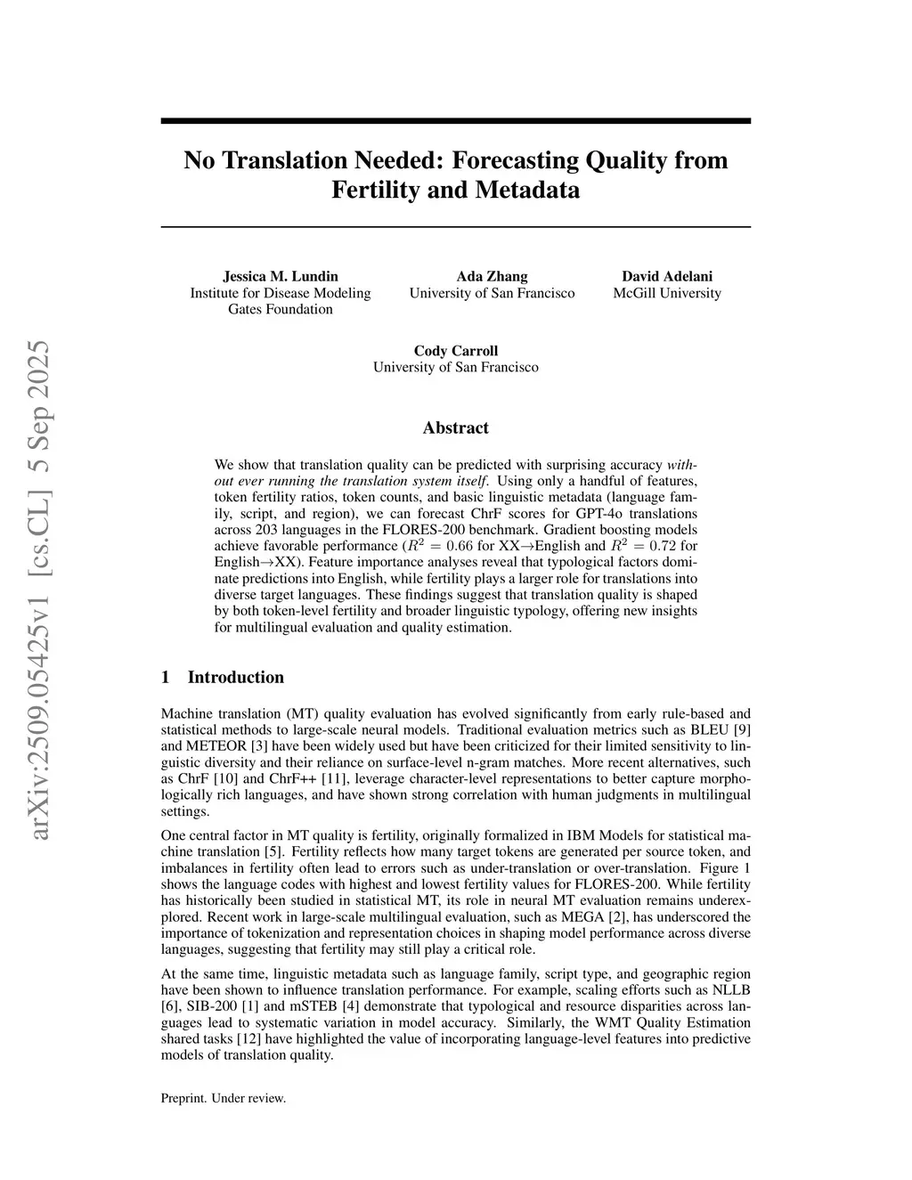 We show that translation quality can be predicted with surprising accuracy \textit{without ever running the translation system itself}. Using only a handful of features, token fertility ratios, token counts, and basic linguistic metadata (language family, script, and region), we can forecast ChrF scores for GPT-4o translations across 203 languages in the FLORES-200 benchmark. Gradient boosting models achieve favorable performance ( for XXEnglish and for EnglishXX). Feature importance analyses reveal that typological factors dominate predictions into English, while fertility plays a larger role for translations into diverse target languages. These findings suggest that translation quality is shaped by both token-level fertility and broader linguistic typology, offering new insights for multilingual evaluation and quality estimation.
