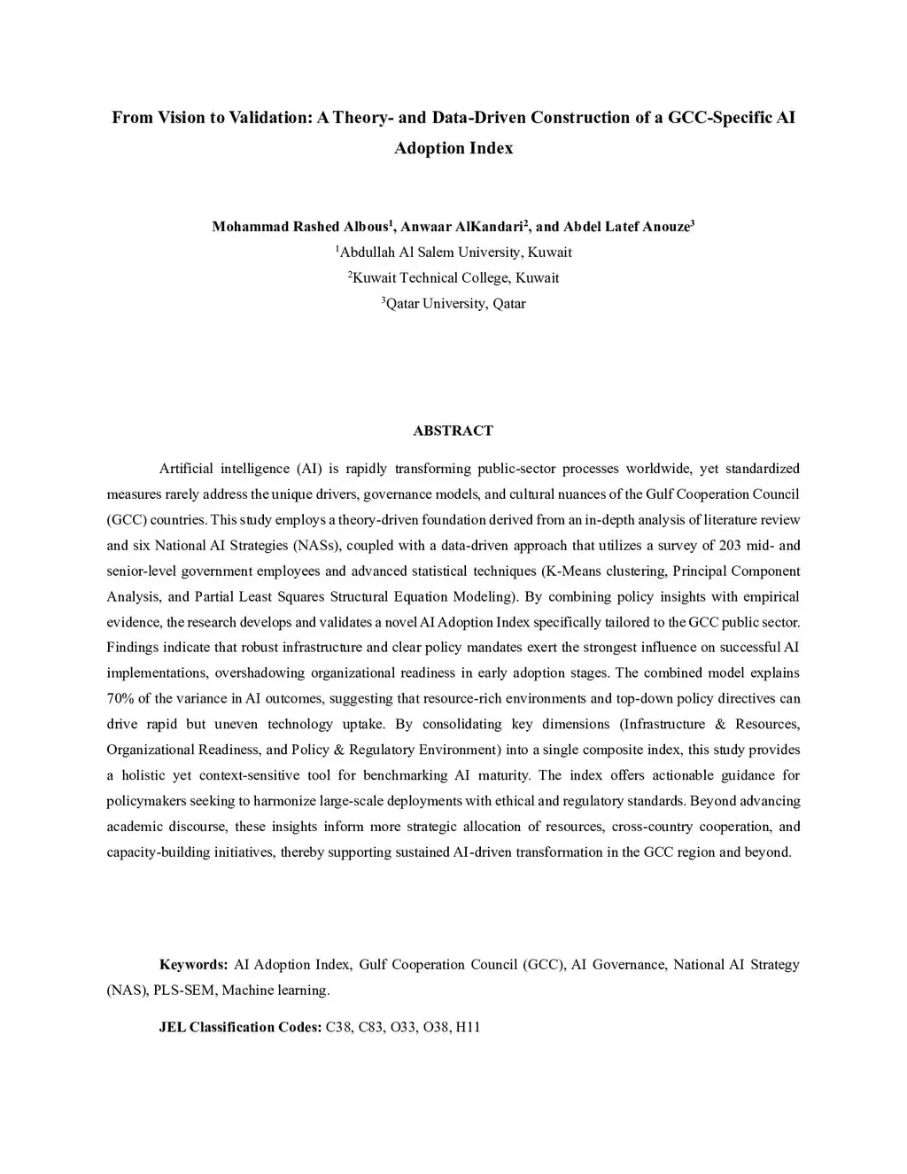 Artificial intelligence (AI) is rapidly transforming public-sector processes worldwide, yet standardized measures rarely address the unique drivers, governance models, and cultural nuances of the Gulf Cooperation Council (GCC) countries. This study employs a theory-driven foundation derived from an in-depth analysis of literature review and six National AI Strategies (NASs), coupled with a data-driven approach that utilizes a survey of 203 mid- and senior-level government employees and advanced statistical techniques (K-Means clustering, Principal Component Analysis, and Partial Least Squares Structural Equation Modeling). By combining policy insights with empirical evidence, the research develops and validates a novel AI Adoption Index specifically tailored to the GCC public sector. Findings indicate that robust technical infrastructure and clear policy mandates exert the strongest influence on successful AI implementations, overshadowing organizational readiness in early adoption stages. The combined model explains 70% of the variance in AI outcomes, suggesting that resource-rich environments and top-down policy directives can drive rapid but uneven technology uptake. By consolidating key dimensions (Technical Infrastructure (TI), Organizational Readiness (OR), and Governance Environment (GE)) into a single composite index, this study provides a holistic yet context-sensitive tool for benchmarking AI maturity. The index offers actionable guidance for policymakers seeking to harmonize large-scale deployments with ethical and regulatory standards. Beyond advancing academic discourse, these insights inform more strategic allocation of resources, cross-country cooperation, and capacity-building initiatives, thereby supporting sustained AI-driven transformation in the GCC region and beyond.