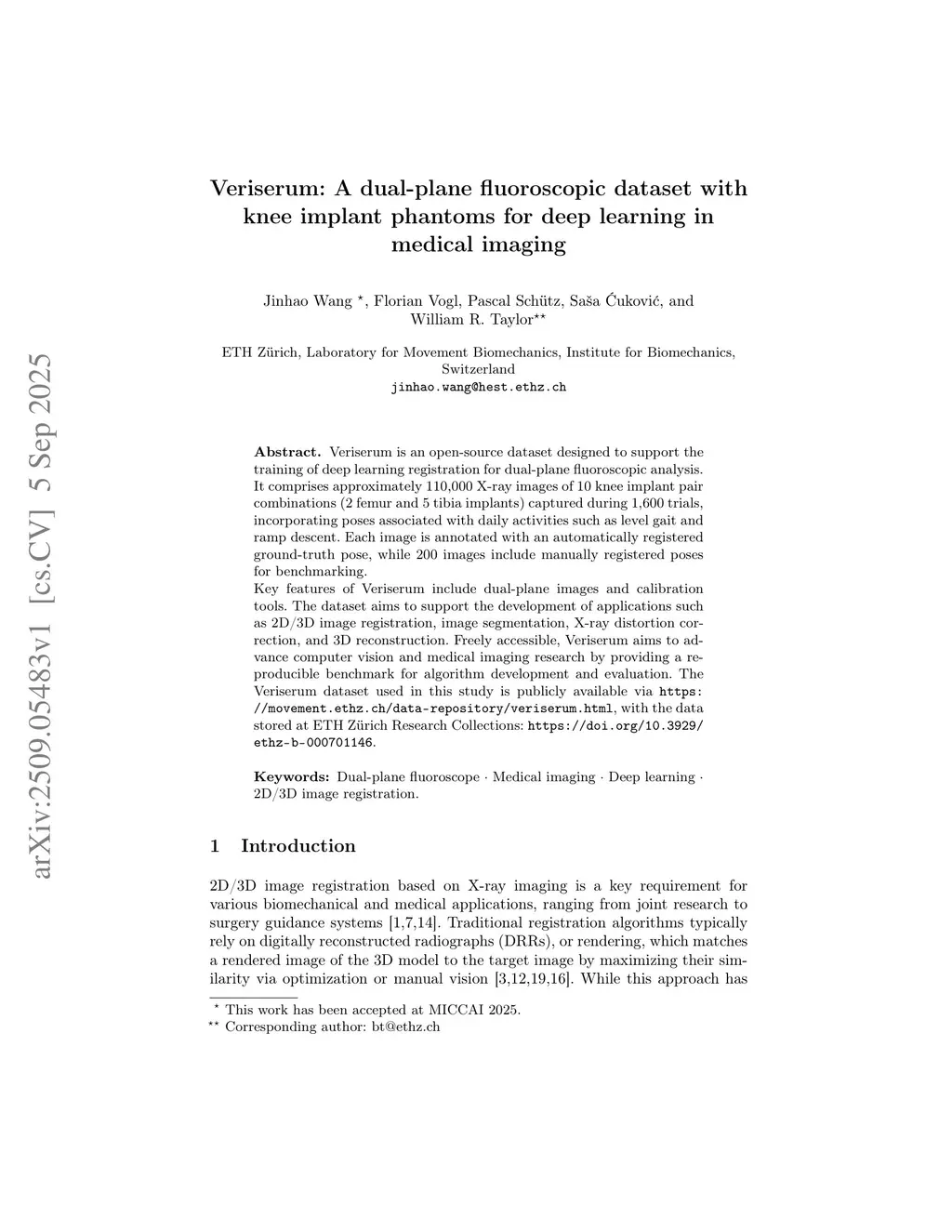 Veriserum is an open-source dataset designed to support the training of deep learning registration for dual-plane fluoroscopic analysis. It comprises approximately 110,000 X-ray images of 10 knee implant pair combinations (2 femur and 5 tibia implants) captured during 1,600 trials, incorporating poses associated with daily activities such as level gait and ramp descent. Each image is annotated with an automatically registered ground-truth pose, while 200 images include manually registered poses for benchmarking.Key features of Veriserum include dual-plane images and calibration tools. The dataset aims to support the development of applications such as 2D/3D image registration, image segmentation, X-ray distortion correction, and 3D reconstruction. Freely accessible, Veriserum aims to advance computer vision and medical imaging research by providing a reproducible benchmark for algorithm development and evaluation. The Veriserum dataset used in this study is publicly available viathis https URL, with the data stored at ETH Zürich Research Collections:this https URL.