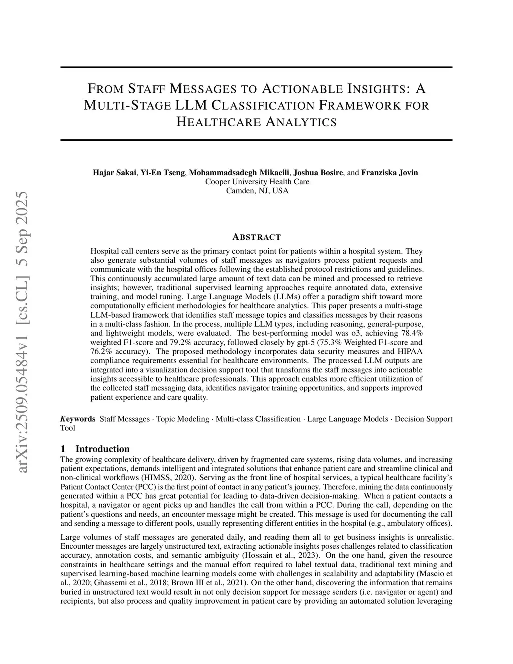 Hospital call centers serve as the primary contact point for patients within a hospital system. They also generate substantial volumes of staff messages as navigators process patient requests and communicate with the hospital offices following the established protocol restrictions and guidelines. This continuously accumulated large amount of text data can be mined and processed to retrieve insights; however, traditional supervised learning approaches require annotated data, extensive training, and model tuning. Large Language Models (LLMs) offer a paradigm shift toward more computationally efficient methodologies for healthcare analytics. This paper presents a multi-stage LLM-based framework that identifies staff message topics and classifies messages by their reasons in a multi-class fashion. In the process, multiple LLM types, including reasoning, general-purpose, and lightweight models, were evaluated. The best-performing model was o3, achieving 78.4% weighted F1-score and 79.2% accuracy, followed closely by gpt-5 (75.3% Weighted F1-score and 76.2% accuracy). The proposed methodology incorporates data security measures and HIPAA compliance requirements essential for healthcare environments. The processed LLM outputs are integrated into a visualization decision support tool that transforms the staff messages into actionable insights accessible to healthcare professionals. This approach enables more efficient utilization of the collected staff messaging data, identifies navigator training opportunities, and supports improved patient experience and care quality.