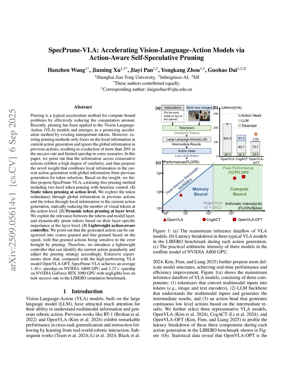 Pruning accelerates compute-bound models by reducing computation. Recently applied to Vision-Language-Action (VLA) models, existing methods prune tokens using only local info from current action, ignoring global context from prior actions, causing >20% success rate drop and limited speedup. We observe high similarity across consecutive actions and propose leveraging both local (current) and global (past) info for smarter token selection. We introduce SpecPrune-VLA, a training-free method with two-level pruning and heuristic control: (1) Static pruning at action level: uses global history and local context to reduce visual tokens per action; (2) Dynamic pruning at layer level: prunes tokens per layer based on layer-specific importance; (3) Lightweight action-aware controller: classifies actions as coarse/fine-grained (by speed), adjusting pruning aggressiveness since fine-grained actions are pruning-sensitive. Experiments on LIBERO show SpecPrune-VLA achieves 1.46 times speedup on NVIDIA A800 and 1.57 times on NVIDIA GeForce RTX 3090 vs. OpenVLA-OFT, with negligible success rate loss.