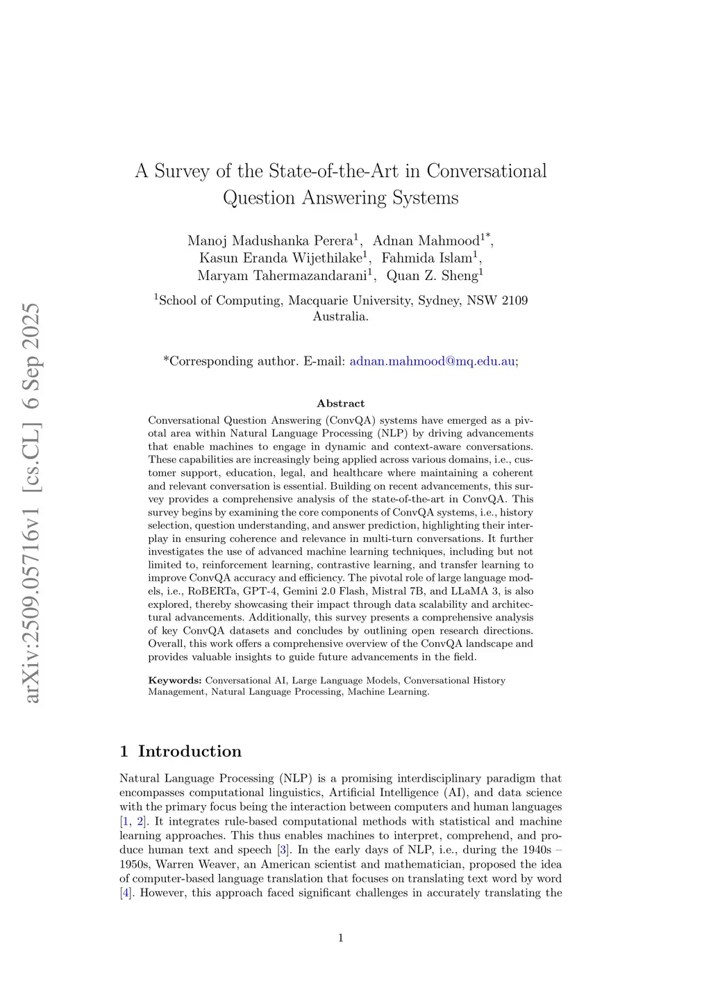 Conversational Question Answering (ConvQA) systems have emerged as a pivotal area within Natural Language Processing (NLP) by driving advancements that enable machines to engage in dynamic and context-aware conversations. These capabilities are increasingly being applied across various domains, i.e., customer support, education, legal, and healthcare where maintaining a coherent and relevant conversation is essential. Building on recent advancements, this survey provides a comprehensive analysis of the state-of-the-art in ConvQA. This survey begins by examining the core components of ConvQA systems, i.e., history selection, question understanding, and answer prediction, highlighting their interplay in ensuring coherence and relevance in multi-turn conversations. It further investigates the use of advanced machine learning techniques, including but not limited to, reinforcement learning, contrastive learning, and transfer learning to improve ConvQA accuracy and efficiency. The pivotal role of large language models, i.e., RoBERTa, GPT-4, Gemini 2.0 Flash, Mistral 7B, and LLaMA 3, is also explored, thereby showcasing their impact through data scalability and architectural advancements. Additionally, this survey presents a comprehensive analysis of key ConvQA datasets and concludes by outlining open research directions. Overall, this work offers a comprehensive overview of the ConvQA landscape and provides valuable insights to guide future advancements in the field.