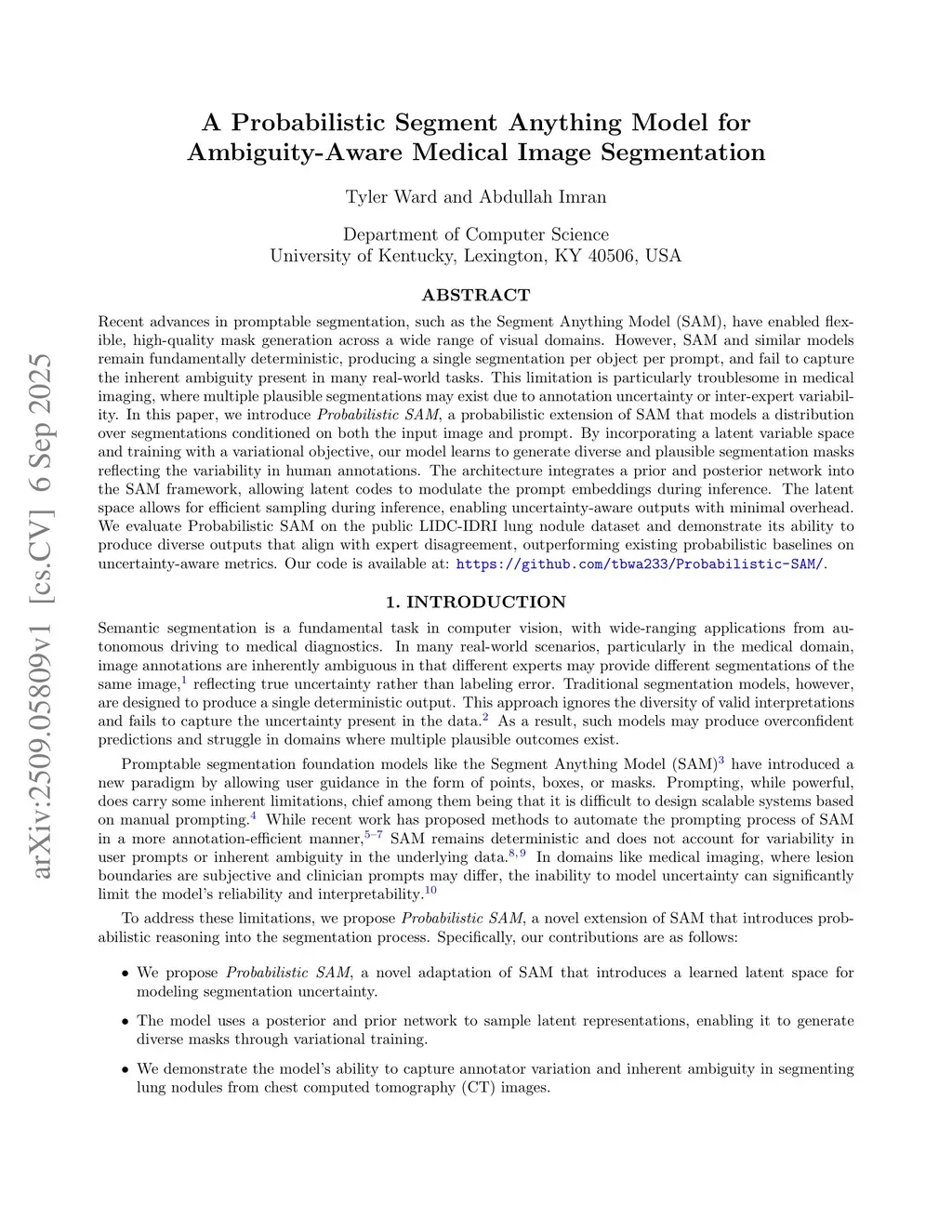 Recent advances in promptable segmentation, such as the Segment Anything Model (SAM), have enabled flexible, high-quality mask generation across a wide range of visual domains. However, SAM and similar models remain fundamentally deterministic, producing a single segmentation per object per prompt, and fail to capture the inherent ambiguity present in many real-world tasks. This limitation is particularly troublesome in medical imaging, where multiple plausible segmentations may exist due to annotation uncertainty or inter-expert variability. In this paper, we introduce Probabilistic SAM, a probabilistic extension of SAM that models a distribution over segmentations conditioned on both the input image and prompt. By incorporating a latent variable space and training with a variational objective, our model learns to generate diverse and plausible segmentation masks reflecting the variability in human annotations. The architecture integrates a prior and posterior network into the SAM framework, allowing latent codes to modulate the prompt embeddings during inference. The latent space allows for efficient sampling during inference, enabling uncertainty-aware outputs with minimal overhead. We evaluate Probabilistic SAM on the public LIDC-IDRI lung nodule dataset and demonstrate its ability to produce diverse outputs that align with expert disagreement, outperforming existing probabilistic baselines on uncertainty-aware metrics. Our code is available at:this https URL.