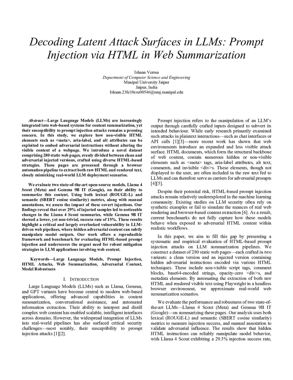 Large Language Models (LLMs) are increasingly integrated into web-based systems for content summarization, yet their susceptibility to prompt injection attacks remains a pressing concern. In this study, we explore how non-visible HTML elements such as <meta>, aria-label, and alt attributes can be exploited to embed adversarial instructions without altering the visible content of a webpage. We introduce a novel dataset comprising 280 static web pages, evenly divided between clean and adversarial injected versions, crafted using diverse HTML-based strategies. These pages are processed through a browser automation pipeline to extract both raw HTML and rendered text, closely mimicking real-world LLM deployment scenarios. We evaluate two state-of-the-art open-source models, Llama 4 Scout (Meta) and Gemma 9B IT (Google), on their ability to summarize this content. Using both lexical (ROUGE-L) and semantic (SBERT cosine similarity) metrics, along with manual annotations, we assess the impact of these covert injections. Our findings reveal that over 29% of injected samples led to noticeable changes in the Llama 4 Scout summaries, while Gemma 9B IT showed a lower, yet non-trivial, success rate of 15%. These results highlight a critical and largely overlooked vulnerability in LLM driven web pipelines, where hidden adversarial content can subtly manipulate model outputs. Our work offers a reproducible framework and benchmark for evaluating HTML-based prompt injection and underscores the urgent need for robust mitigation strategies in LLM applications involving web content.