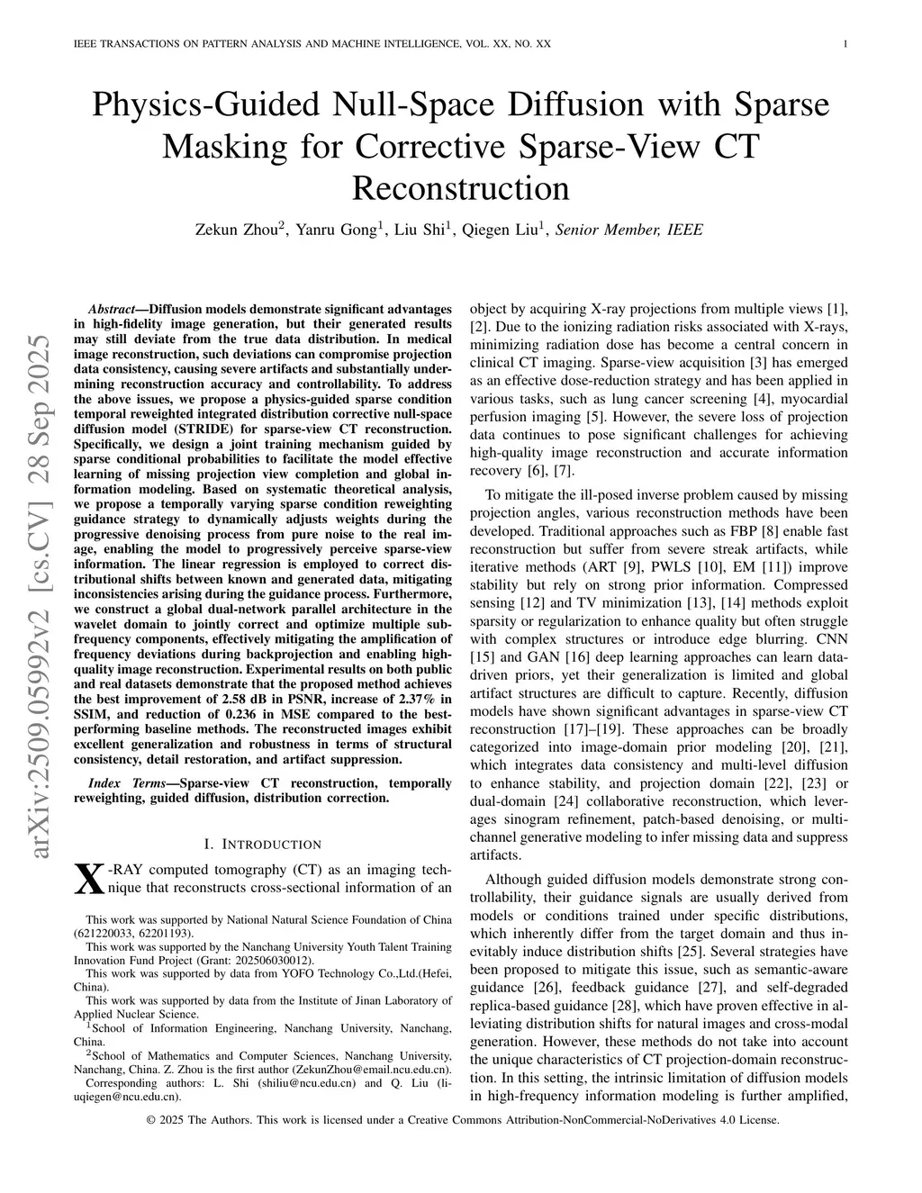 Diffusion models have demonstrated remarkable generative capabilities in image processing tasks. We propose a Sparse condition Temporal Rewighted Integrated Distribution Estimation guided diffusion model (STRIDE) for sparse-view CT reconstruction. Specifically, we design a joint training mechanism guided by sparse conditional probabilities to facilitate the model effective learning of missing projection view completion and global information modeling. Based on systematic theoretical analysis, we propose a temporally varying sparse condition reweighting guidance strategy to dynamically adjusts weights during the progressive denoising process from pure noise to the real image, enabling the model to progressively perceive sparse-view information. The linear regression is employed to correct distributional shifts between known and generated data, mitigating inconsistencies arising during the guidance process. Furthermore, we construct a dual-network parallel architecture to perform global correction and optimization across multiple sub-frequency components, thereby effectively improving the model capability in both detail restoration and structural preservation, ultimately achieving high-quality image reconstruction. Experimental results on both public and real datasets demonstrate that the proposed method achieves the best improvement of 2.58 dB in PSNR, increase of 2.37\% in SSIM, and reduction of 0.236 in MSE compared to the best-performing baseline methods. The reconstructed images exhibit excellent generalization and robustness in terms of structural consistency, detail restoration, and artifact suppression.
