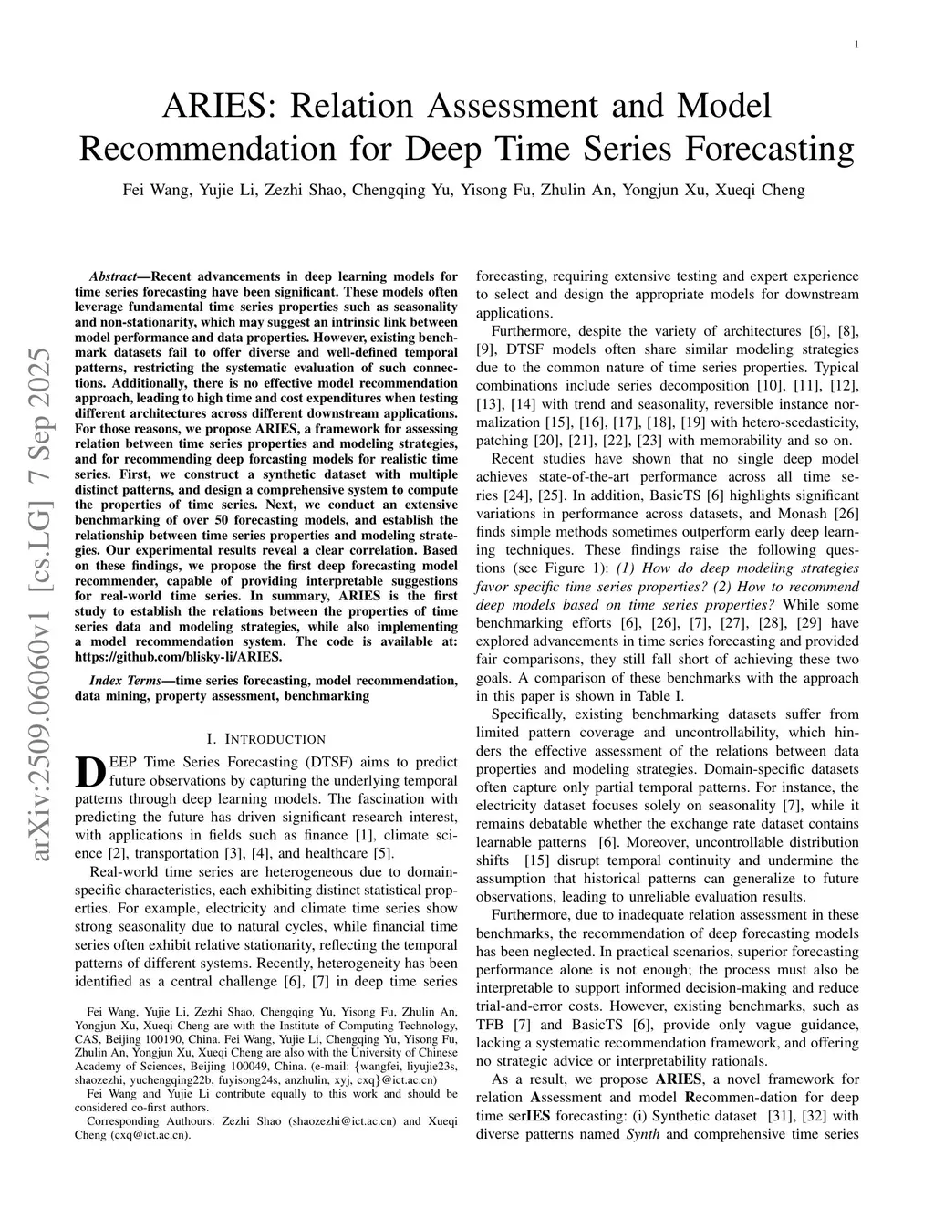 ARIES: Relation Assessment and Model Recommendation for Deep Time Series Forecasting