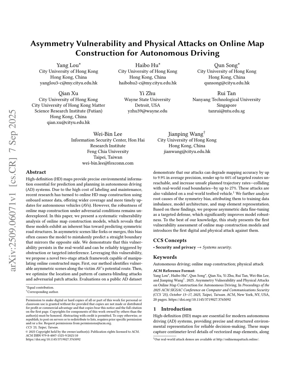 Asymmetry Vulnerability and Physical Attacks on Online Map Construction for Autonomous Driving