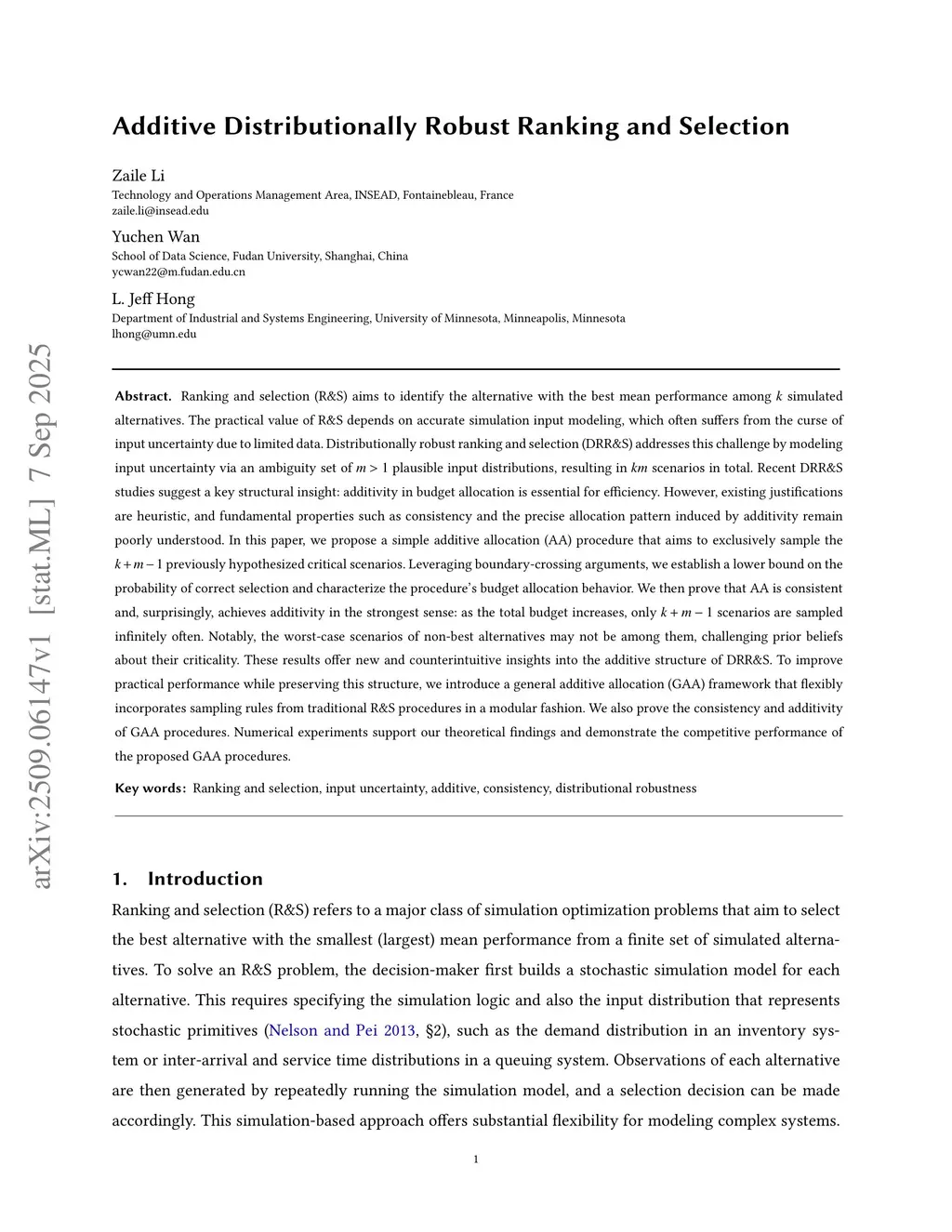 Ranking and selection (R&S) aims to identify the alternative with the best mean performance among simulated alternatives. The practical value of R&S depends on accurate simulation input modeling, which often suffers from the curse of input uncertainty due to limited data. Distributionally robust ranking and selection (DRR&S) addresses this challenge by modeling input uncertainty via an ambiguity set of plausible input distributions, resulting in scenarios in total. Recent DRR&S studies suggest a key structural insight: additivity in budget allocation is essential for efficiency. However, existing justifications are heuristic, and fundamental properties such as consistency and the precise allocation pattern induced by additivity remain poorly understood. In this paper, we propose a simple additive allocation (AA) procedure that aims to exclusively sample the previously hypothesized critical scenarios. Leveraging boundary-crossing arguments, we establish a lower bound on the probability of correct selection and characterize the procedure's budget allocation behavior. We then prove that AA is consistent and, surprisingly, achieves additivity in the strongest sense: as the total budget increases, only scenarios are sampled infinitely often. Notably, the worst-case scenarios of non-best alternatives may not be among them, challenging prior beliefs about their criticality. These results offer new and counterintuitive insights into the additive structure of DRR&S. To improve practical performance while preserving this structure, we introduce a general additive allocation (GAA) framework that flexibly incorporates sampling rules from traditional R&S procedures in a modular fashion. Numerical experiments support our theoretical findings and demonstrate the competitive performance of the proposed GAA procedures.