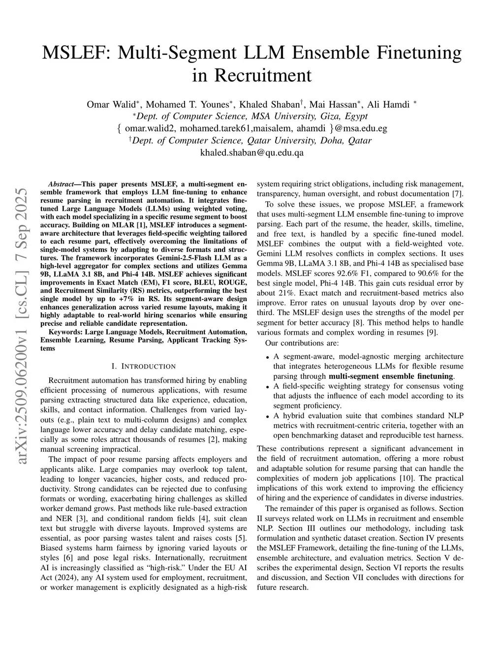 This paper presents MSLEF, a multi-segment ensemble framework that employs LLM fine-tuning to enhance resume parsing in recruitment automation. It integrates fine-tuned Large Language Models (LLMs) using weighted voting, with each model specializing in a specific resume segment to boost accuracy. Building on MLAR , MSLEF introduces a segment-aware architecture that leverages field-specific weighting tailored to each resume part, effectively overcoming the limitations of single-model systems by adapting to diverse formats and structures. The framework incorporates Gemini-2.5-Flash LLM as a high-level aggregator for complex sections and utilizes Gemma 9B, LLaMA 3.1 8B, and Phi-4 14B. MSLEF achieves significant improvements in Exact Match (EM), F1 score, BLEU, ROUGE, and Recruitment Similarity (RS) metrics, outperforming the best single model by up to +7% in RS. Its segment-aware design enhances generalization across varied resume layouts, making it highly adaptable to real-world hiring scenarios while ensuring precise and reliable candidate representation.