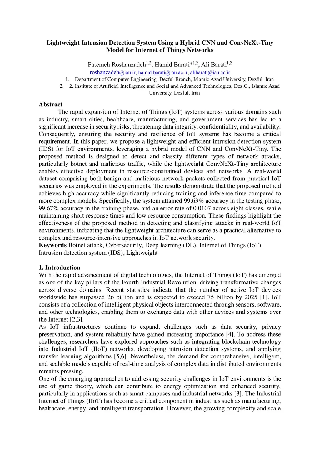 Lightweight Intrusion Detection System Using a Hybrid CNN and ConvNeXt-Tiny Model for Internet of Things Networks