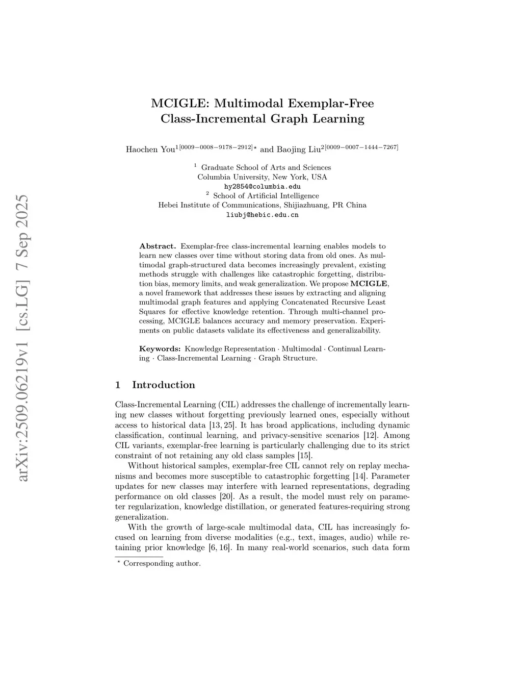 Exemplar-free class-incremental learning enables models to learn new classes over time without storing data from old ones. As multimodal graph-structured data becomes increasingly prevalent, existing methods struggle with challenges like catastrophic forgetting, distribution bias, memory limits, and weak generalization. We propose MCIGLE, a novel framework that addresses these issues by extracting and aligning multimodal graph features and applying Concatenated Recursive Least Squares for effective knowledge retention. Through multi-channel processing, MCIGLE balances accuracy and memory preservation. Experiments on public datasets validate its effectiveness and generalizability.