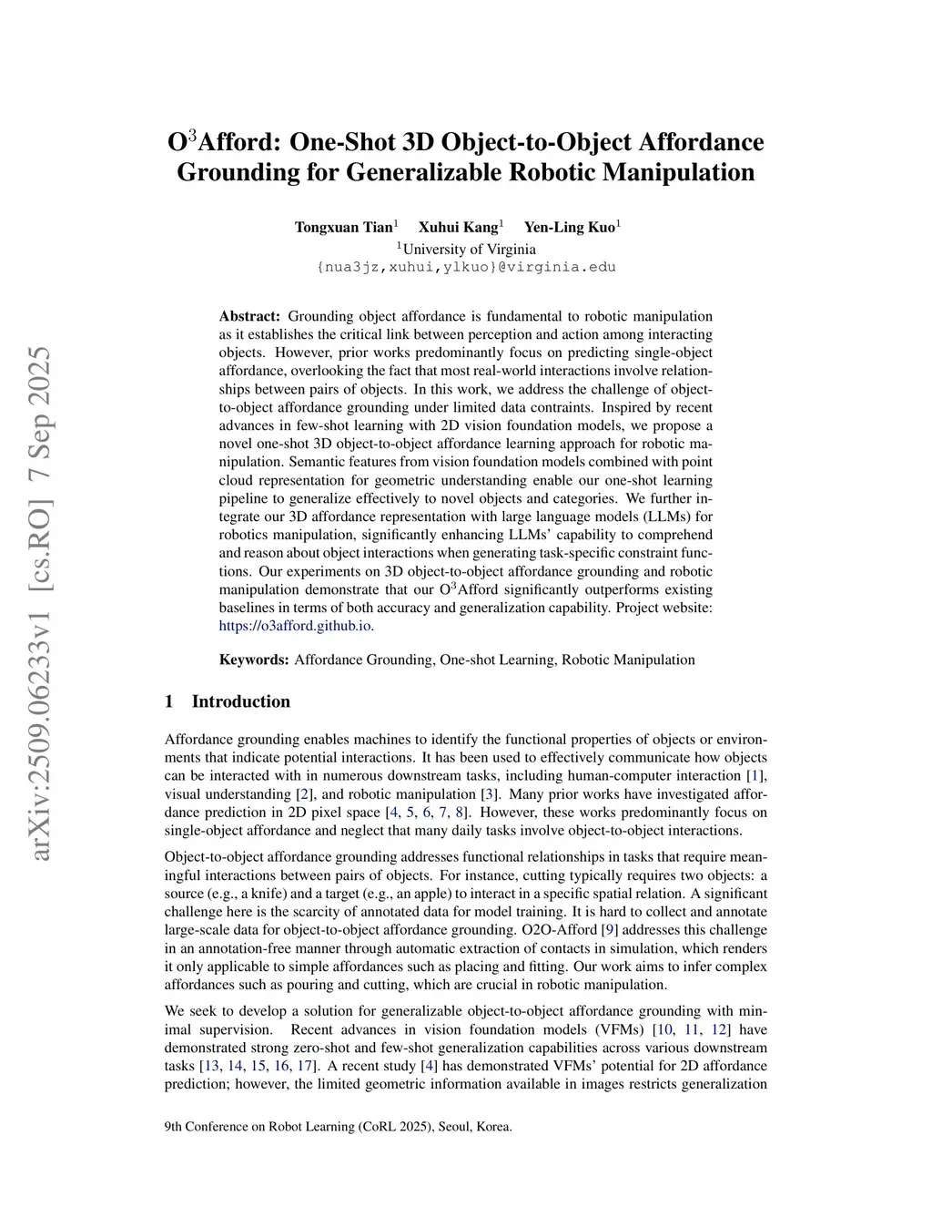 Grounding object affordance is fundamental to robotic manipulation as it establishes the critical link between perception and action among interacting objects. However, prior works predominantly focus on predicting single-object affordance, overlooking the fact that most real-world interactions involve relationships between pairs of objects. In this work, we address the challenge of object-to-object affordance grounding under limited data contraints. Inspired by recent advances in few-shot learning with 2D vision foundation models, we propose a novel one-shot 3D object-to-object affordance learning approach for robotic manipulation. Semantic features from vision foundation models combined with point cloud representation for geometric understanding enable our one-shot learning pipeline to generalize effectively to novel objects and categories. We further integrate our 3D affordance representation with large language models (LLMs) for robotics manipulation, significantly enhancing LLMs' capability to comprehend and reason about object interactions when generating task-specific constraint functions. Our experiments on 3D object-to-object affordance grounding and robotic manipulation demonstrate that our OAfford significantly outperforms existing baselines in terms of both accuracy and generalization capability.