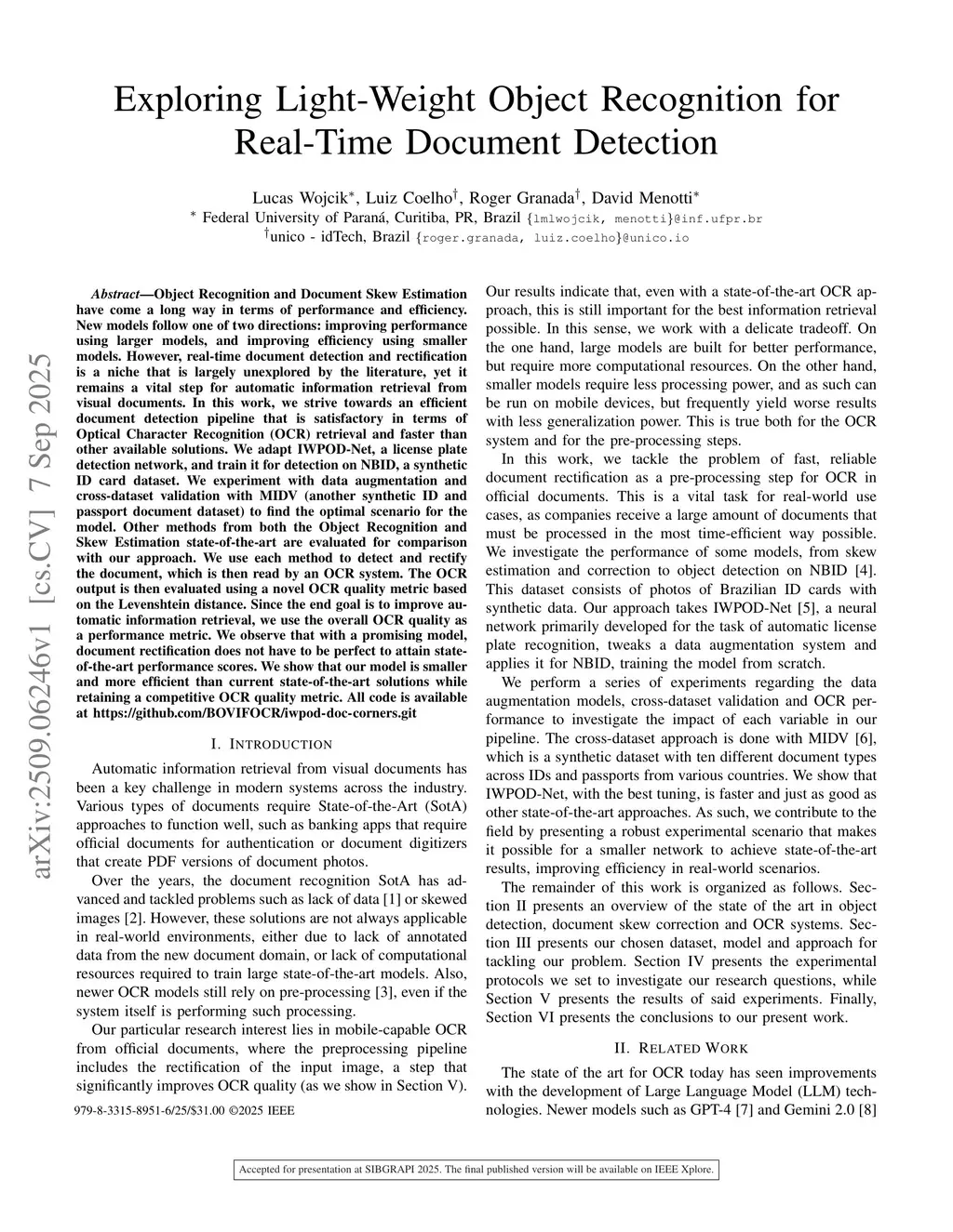 Object Recognition and Document Skew Estimation have come a long way in terms of performance and efficiency. New models follow one of two directions: improving performance using larger models, and improving efficiency using smaller models. However, real-time document detection and rectification is a niche that is largely unexplored by the literature, yet it remains a vital step for automatic information retrieval from visual documents. In this work, we strive towards an efficient document detection pipeline that is satisfactory in terms of Optical Character Recognition (OCR) retrieval and faster than other available solutions. We adapt IWPOD-Net, a license plate detection network, and train it for detection on NBID, a synthetic ID card dataset. We experiment with data augmentation and cross-dataset validation with MIDV (another synthetic ID and passport document dataset) to find the optimal scenario for the model. Other methods from both the Object Recognition and Skew Estimation state-of-the-art are evaluated for comparison with our approach. We use each method to detect and rectify the document, which is then read by an OCR system. The OCR output is then evaluated using a novel OCR quality metric based on the Levenshtein distance. Since the end goal is to improve automatic information retrieval, we use the overall OCR quality as a performance metric. We observe that with a promising model, document rectification does not have to be perfect to attain state-of-the-art performance scores. We show that our model is smaller and more efficient than current state-of-the-art solutions while retaining a competitive OCR quality metric. All code is available atthis https URL