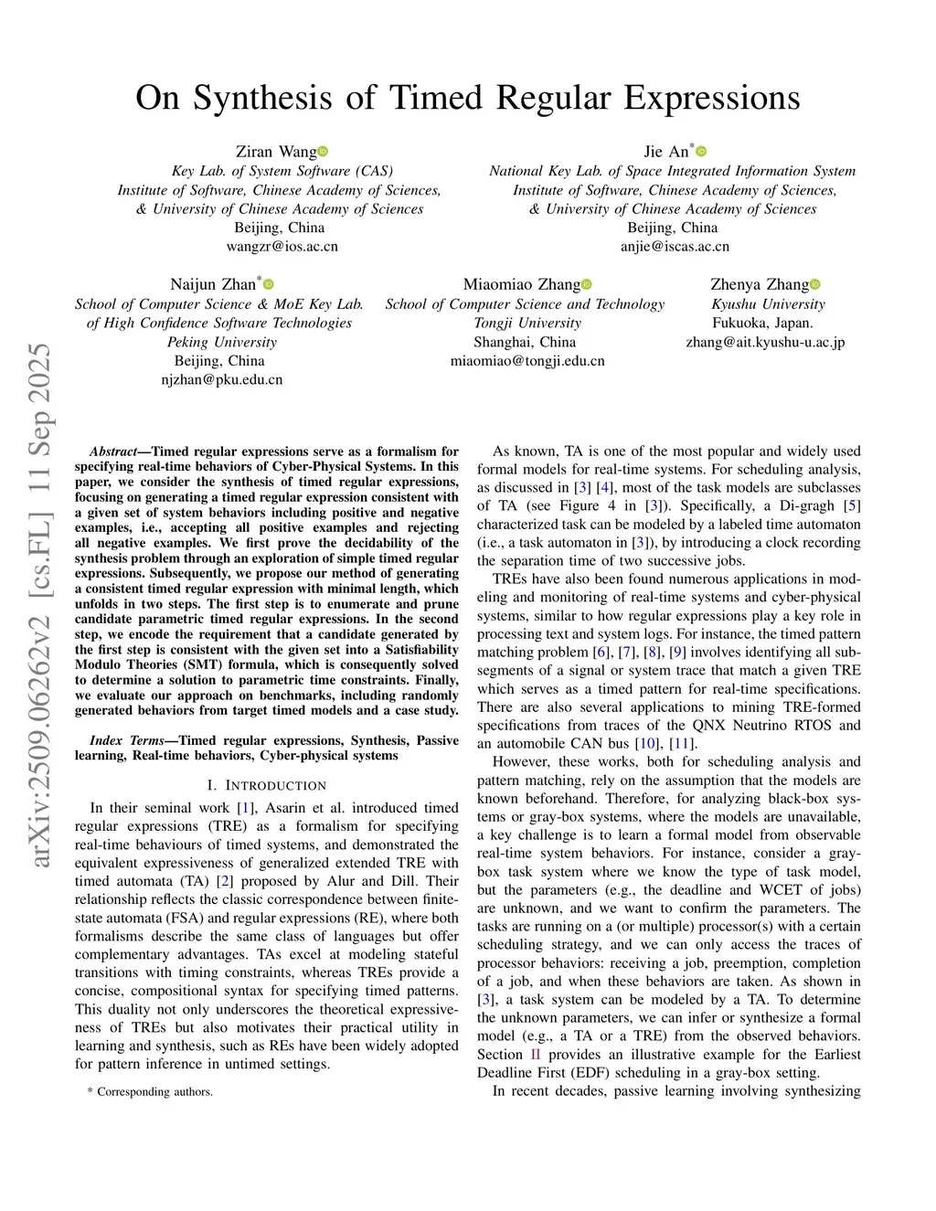 Timed regular expressions serve as a formalism for specifying real-time behaviors of Cyber-Physical Systems. In this paper, we consider the synthesis of timed regular expressions, focusing on generating a timed regular expression consistent with a given set of system behaviors including positive and negative examples, i.e., accepting all positive examples and rejecting all negative examples. We first prove the decidability of the synthesis problem through an exploration of simple timed regular expressions. Subsequently, we propose our method of generating a consistent timed regular expression with minimal length, which unfolds in two steps. The first step is to enumerate and prune candidate parametric timed regular expressions. In the second step, we encode the requirement that a candidate generated by the first step is consistent with the given set into a Satisfiability Modulo Theories (SMT) formula, which is consequently solved to determine a solution to parametric time constraints. Finally, we evaluate our approach on benchmarks, including randomly generated behaviors from target timed models and a case study.