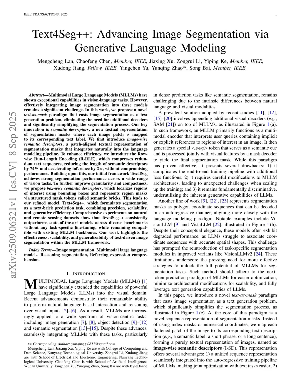 Multimodal Large Language Models (MLLMs) have shown exceptional capabilities in vision-language tasks. However, effectively integrating image segmentation into these models remains a significant challenge. In this work, we propose a novel text-as-mask paradigm that casts image segmentation as a text generation problem, eliminating the need for additional decoders and significantly simplifying the segmentation process. Our key innovation is semantic descriptors, a new textual representation of segmentation masks where each image patch is mapped to its corresponding text label. We first introduce image-wise semantic descriptors, a patch-aligned textual representation of segmentation masks that integrates naturally into the language modeling pipeline. To enhance efficiency, we introduce the Row-wise Run-Length Encoding (R-RLE), which compresses redundant text sequences, reducing the length of semantic descriptors by 74% and accelerating inference by , without compromising performance. Building upon this, our initial framework Text4Seg achieves strong segmentation performance across a wide range of vision tasks. To further improve granularity and compactness, we propose box-wise semantic descriptors, which localizes regions of interest using bounding boxes and represents region masks via structured mask tokens called semantic bricks. This leads to our refined model, Text4Seg++, which formulates segmentation as a next-brick prediction task, combining precision, scalability, and generative efficiency. Comprehensive experiments on natural and remote sensing datasets show that Text4Seg++ consistently outperforms state-of-the-art models across diverse benchmarks without any task-specific fine-tuning, while remaining compatible with existing MLLM backbones. Our work highlights the effectiveness, scalability, and generalizability of text-driven image segmentation within the MLLM framework.
