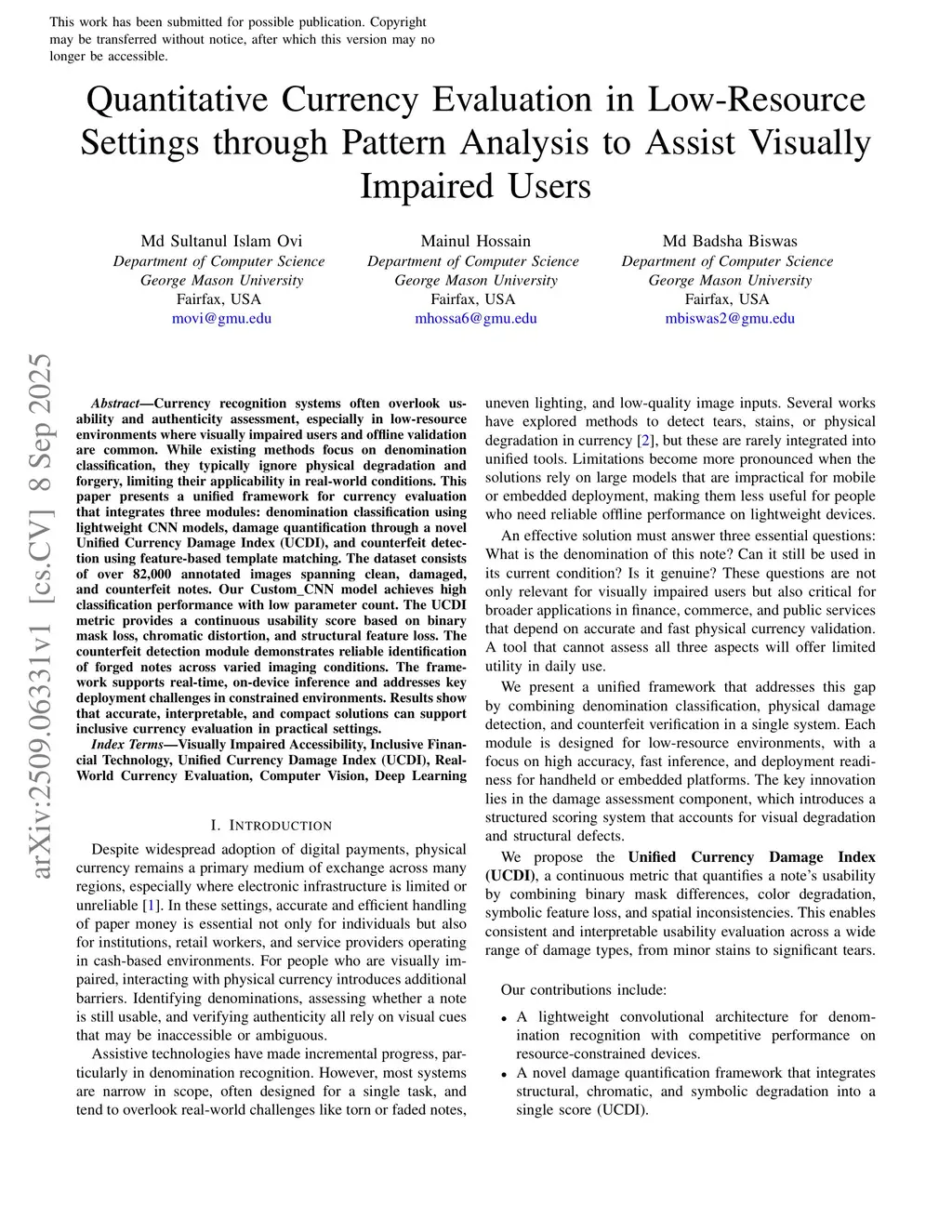 Currency recognition systems often overlook usability and authenticity assessment, especially in low-resource environments where visually impaired users and offline validation are common. While existing methods focus on denomination classification, they typically ignore physical degradation and forgery, limiting their applicability in real-world conditions. This paper presents a unified framework for currency evaluation that integrates three modules: denomination classification using lightweight CNN models, damage quantification through a novel Unified Currency Damage Index (UCDI), and counterfeit detection using feature-based template matching. The dataset consists of over 82,000 annotated images spanning clean, damaged, and counterfeit notes. Our Custom_CNN model achieves high classification performance with low parameter count. The UCDI metric provides a continuous usability score based on binary mask loss, chromatic distortion, and structural feature loss. The counterfeit detection module demonstrates reliable identification of forged notes across varied imaging conditions. The framework supports real-time, on-device inference and addresses key deployment challenges in constrained environments. Results show that accurate, interpretable, and compact solutions can support inclusive currency evaluation in practical settings.