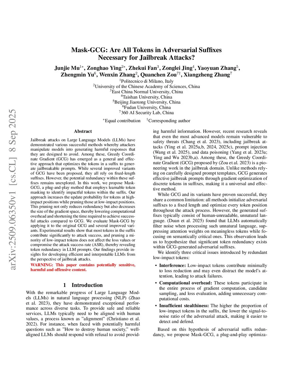 Mask-GCG: Are All Tokens in Adversarial Suffixes Necessary for Jailbreak Attacks?