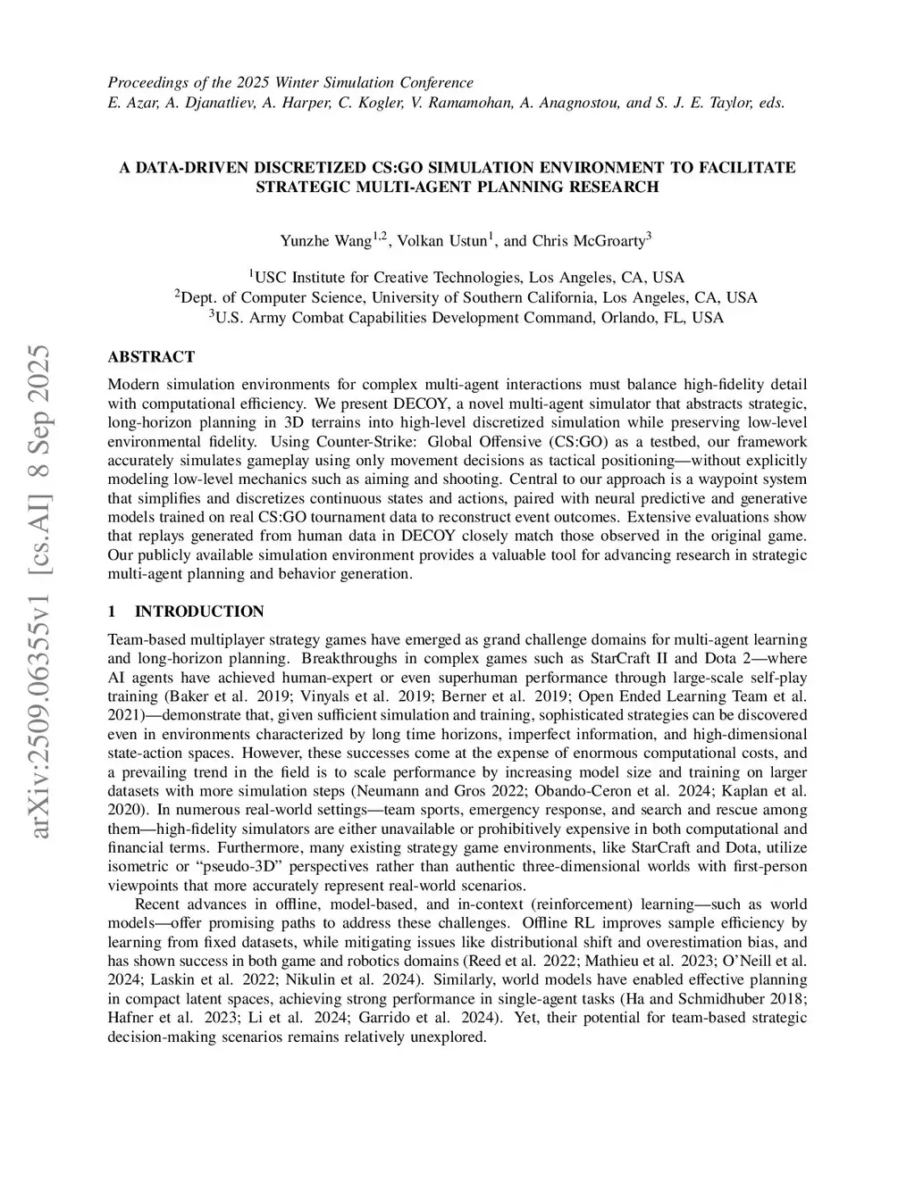 Modern simulation environments for complex multi-agent interactions must balance high-fidelity detail with computational efficiency. We present DECOY, a novel multi-agent simulator that abstracts strategic, long-horizon planning in 3D terrains into high-level discretized simulation while preserving low-level environmental fidelity. Using Counter-Strike: Global Offensive (CS:GO) as a testbed, our framework accurately simulates gameplay using only movement decisions as tactical positioning -- without explicitly modeling low-level mechanics such as aiming and shooting. Central to our approach is a waypoint system that simplifies and discretizes continuous states and actions, paired with neural predictive and generative models trained on real CS:GO tournament data to reconstruct event outcomes. Extensive evaluations show that replays generated from human data in DECOY closely match those observed in the original game. Our publicly available simulation environment provides a valuable tool for advancing research in strategic multi-agent planning and behavior generation.