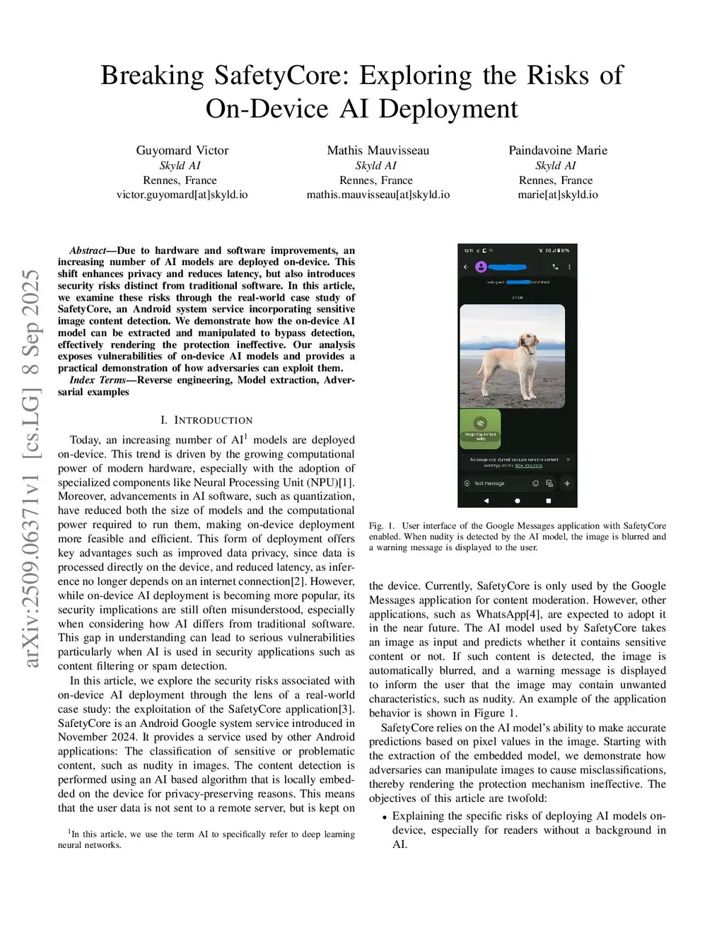Due to hardware and software improvements, an increasing number of AI models are deployed on-device. This shift enhances privacy and reduces latency, but also introduces security risks distinct from traditional software. In this article, we examine these risks through the real-world case study of SafetyCore, an Android system service incorporating sensitive image content detection. We demonstrate how the on-device AI model can be extracted and manipulated to bypass detection, effectively rendering the protection ineffective. Our analysis exposes vulnerabilities of on-device AI models and provides a practical demonstration of how adversaries can exploit them.