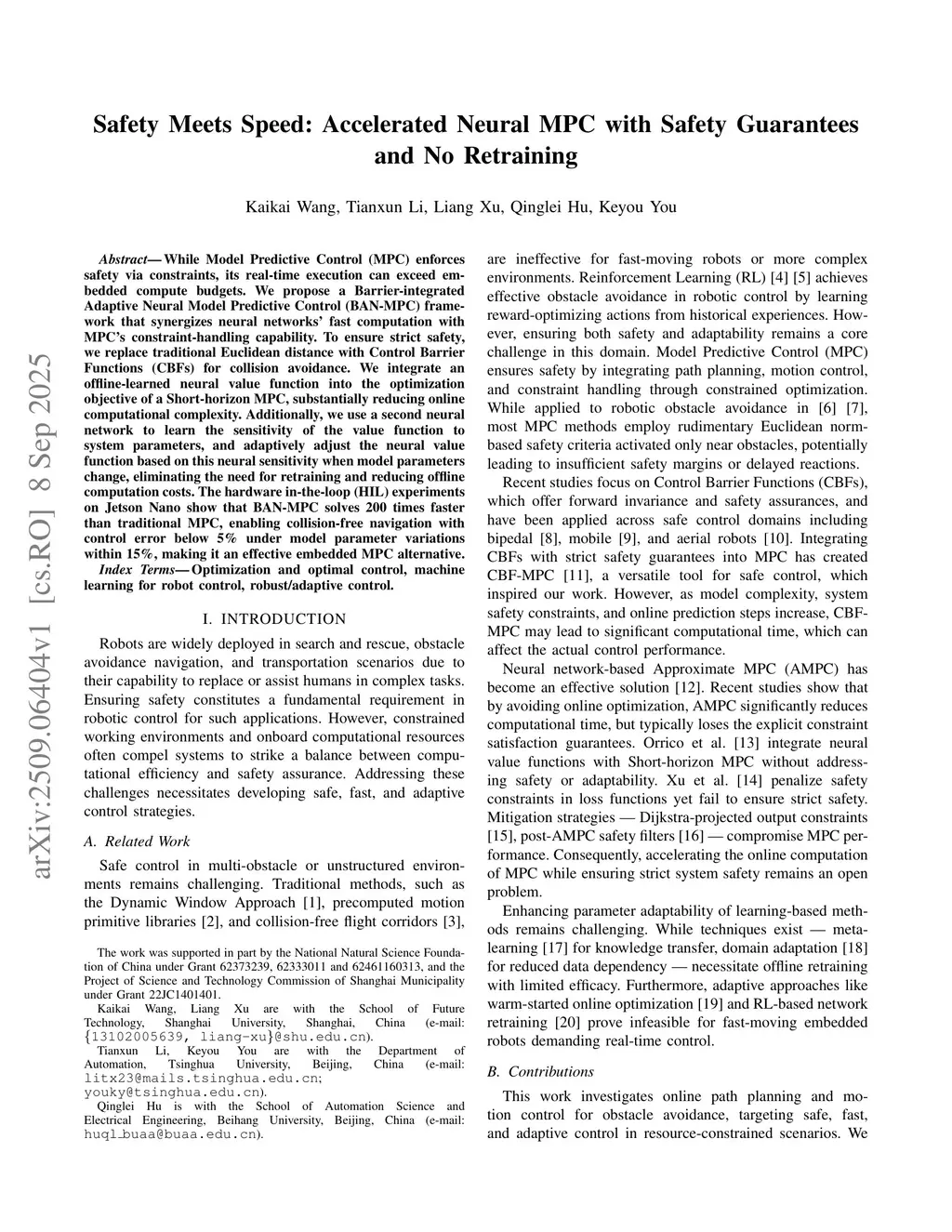 While Model Predictive Control (MPC) enforces safety via constraints, its real-time execution can exceed embedded compute budgets. We propose a Barrier-integrated Adaptive Neural Model Predictive Control (BAN-MPC) framework that synergizes neural networks' fast computation with MPC's constraint-handling capability. To ensure strict safety, we replace traditional Euclidean distance with Control Barrier Functions (CBFs) for collision avoidance. We integrate an offline-learned neural value function into the optimization objective of a Short-horizon MPC, substantially reducing online computational complexity. Additionally, we use a second neural network to learn the sensitivity of the value function to system parameters, and adaptively adjust the neural value function based on this neural sensitivity when model parameters change, eliminating the need for retraining and reducing offline computation costs. The hardware in-the-loop (HIL) experiments on Jetson Nano show that BAN-MPC solves 200 times faster than traditional MPC, enabling collision-free navigation with control error below 5\% under model parameter variations within 15\%, making it an effective embedded MPC alternative.