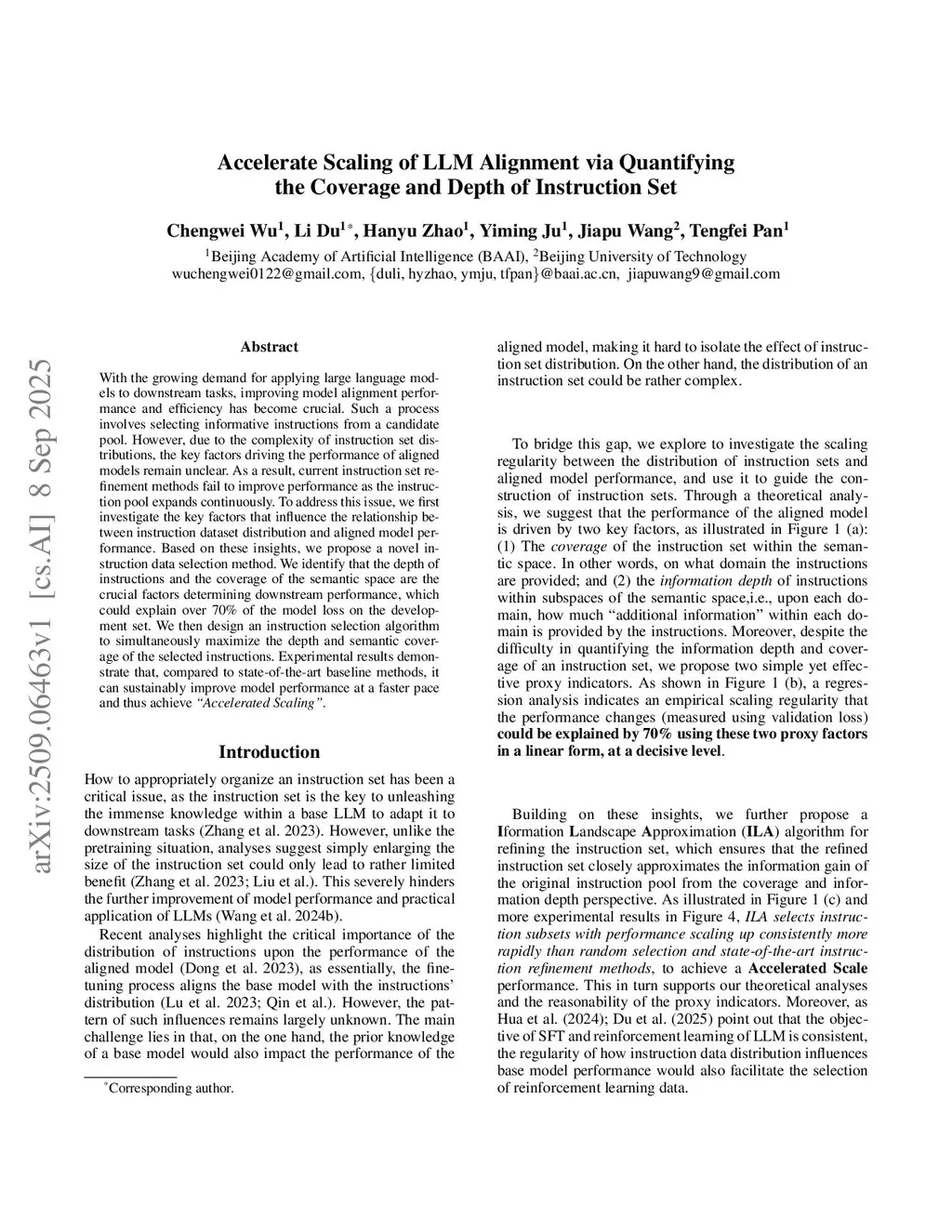 Scaling the amount of data used for supervied fine-tuning(SFT) does not guarantee the proportional gains in model performance, highlighting a critical need to understand what makes training samples effective. This work identifies two fundamental dataset properties that govern SFT scalability: \textbf{semantic coverage}, or the breadth of task domains, and \textbf{information depth}, or the richness of individual examples. We demonstrate that simple proxies for these properties explain the majority of validation loss variance in our experiments. In this work, we further propose the \textbf{Information Landscape Approximation (ILA)}, a model-agnostic data selection framework that jointly optimizes for these two factors. ILA constructs compact subsets that approximate the informational value of large datasets. Empirical results show that models tuned on ILA-selected data achieve faster and more sustained performance improvements across diverse tasks and model sizes compared to existing methods, a phenomenon we term \textbf{accelerated scaling}.