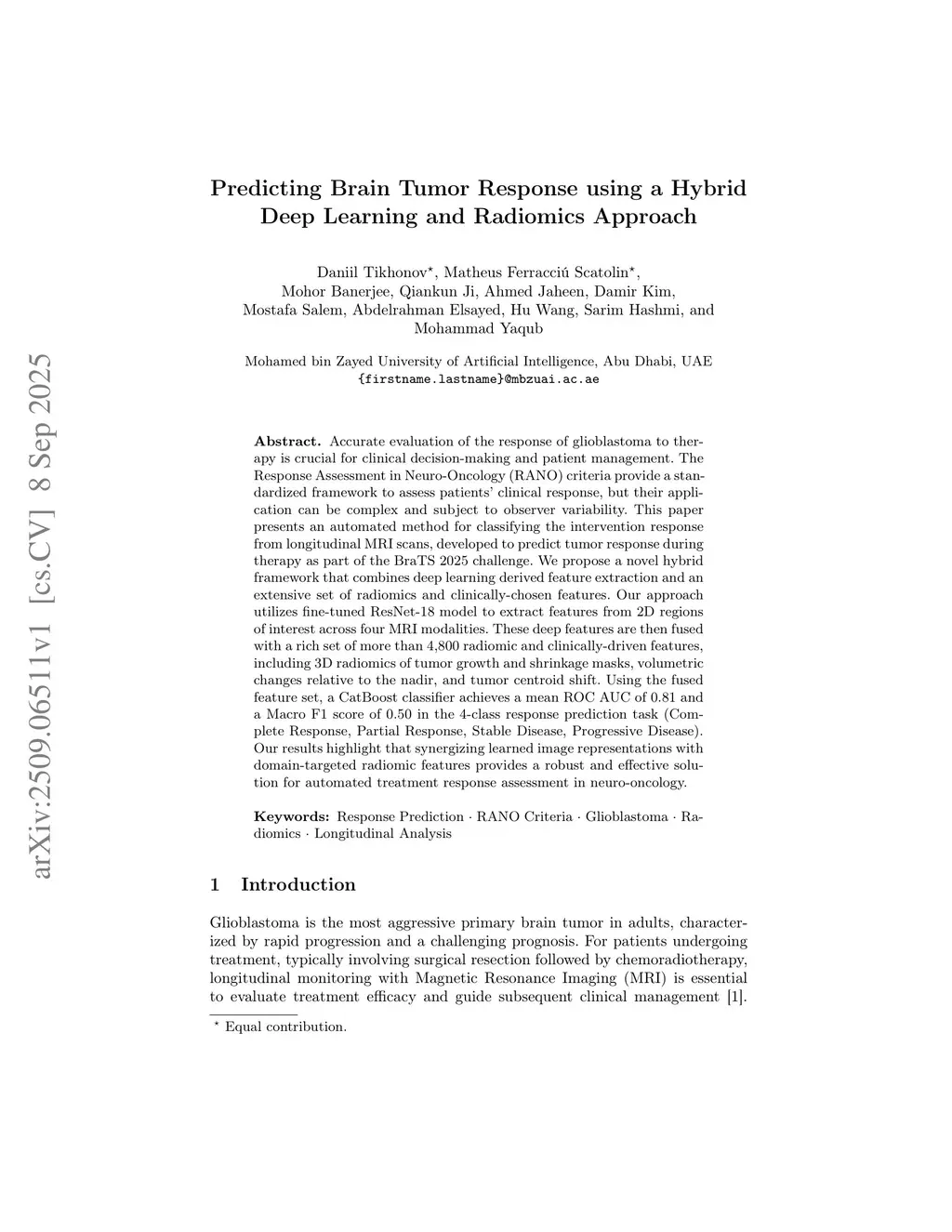 Predicting Brain Tumor Response to Therapy using a Hybrid Deep Learning and Radiomics Approach