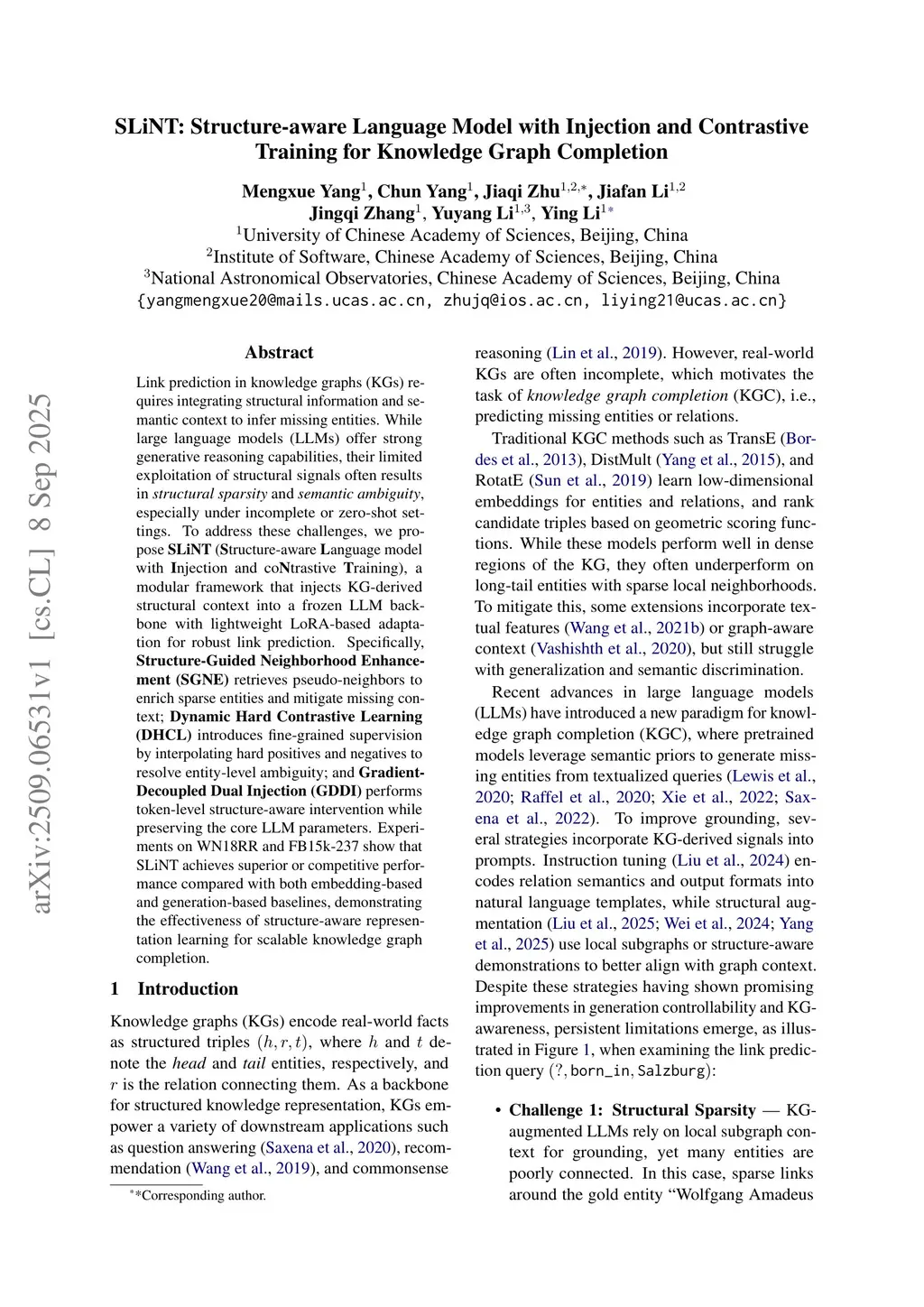 Link prediction in knowledge graphs requires integrating structural information and semantic context to infer missing entities. While large language models offer strong generative reasoning capabilities, their limited exploitation of structural signals often results in structural sparsity and semantic ambiguity, especially under incomplete or zero-shot settings. To address these challenges, we propose SLiNT (Structure-aware Language model with Injection and coNtrastive Training), a modular framework that injects knowledge-graph-derived structural context into a frozen LLM backbone with lightweight LoRA-based adaptation for robust link prediction. Specifically, Structure-Guided Neighborhood Enhancement (SGNE) retrieves pseudo-neighbors to enrich sparse entities and mitigate missing context; Dynamic Hard Contrastive Learning (DHCL) introduces fine-grained supervision by interpolating hard positives and negatives to resolve entity-level ambiguity; and Gradient-Decoupled Dual Injection (GDDI) performs token-level structure-aware intervention while preserving the core LLM parameters. Experiments on WN18RR and FB15k-237 show that SLiNT achieves superior or competitive performance compared with both embedding-based and generation-based baselines, demonstrating the effectiveness of structure-aware representation learning for scalable knowledge graph completion.