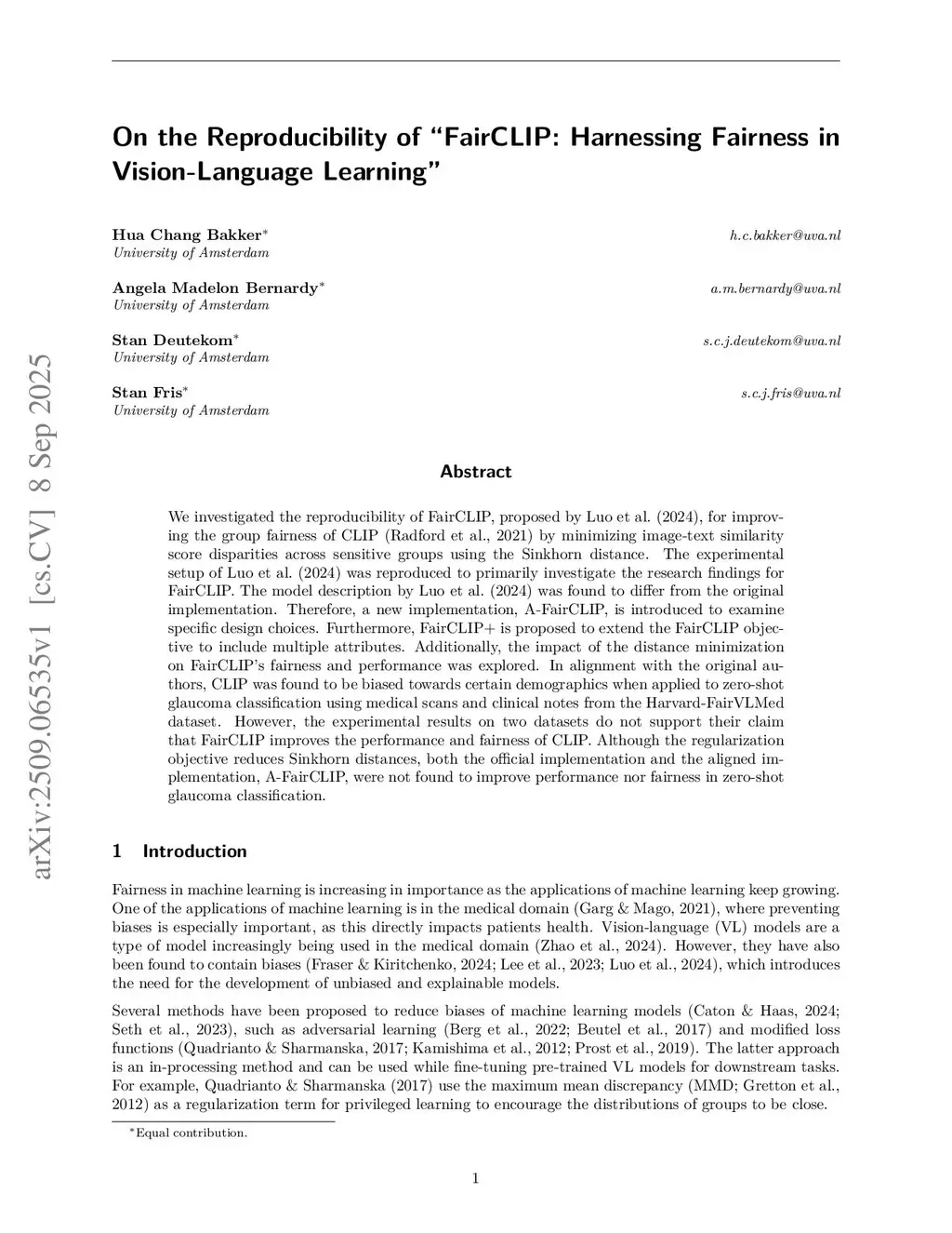 We investigated the reproducibility of FairCLIP, proposed by Luo et al. (2024), for improving the group fairness of CLIP (Radford et al., 2021) by minimizing image-text similarity score disparities across sensitive groups using the Sinkhorn distance. The experimental setup of Luo et al. (2024) was reproduced to primarily investigate the research findings for FairCLIP. The model description by Luo et al. (2024) was found to differ from the original implementation. Therefore, a new implementation, A-FairCLIP, is introduced to examine specific design choices. Furthermore, FairCLIP+ is proposed to extend the FairCLIP objective to include multiple attributes. Additionally, the impact of the distance minimization on FairCLIP's fairness and performance was explored. In alignment with the original authors, CLIP was found to be biased towards certain demographics when applied to zero-shot glaucoma classification using medical scans and clinical notes from the Harvard-FairVLMed dataset. However, the experimental results on two datasets do not support their claim that FairCLIP improves the performance and fairness of CLIP. Although the regularization objective reduces Sinkhorn distances, both the official implementation and the aligned implementation, A-FairCLIP, were not found to improve performance nor fairness in zero-shot glaucoma classification.