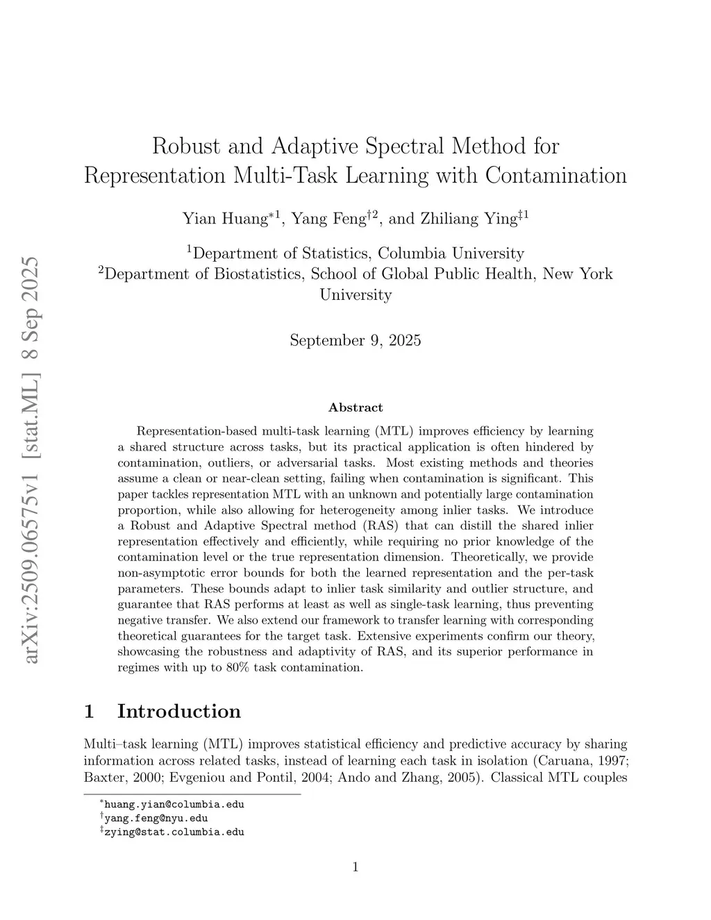 Representation-based multi-task learning (MTL) improves efficiency by learning a shared structure across tasks, but its practical application is often hindered by contamination, outliers, or adversarial tasks. Most existing methods and theories assume a clean or near-clean setting, failing when contamination is significant. This paper tackles representation MTL with an unknown and potentially large contamination proportion, while also allowing for heterogeneity among inlier tasks. We introduce a Robust and Adaptive Spectral method (RAS) that can distill the shared inlier representation effectively and efficiently, while requiring no prior knowledge of the contamination level or the true representation dimension. Theoretically, we provide non-asymptotic error bounds for both the learned representation and the per-task parameters. These bounds adapt to inlier task similarity and outlier structure, and guarantee that RAS performs at least as well as single-task learning, thus preventing negative transfer. We also extend our framework to transfer learning with corresponding theoretical guarantees for the target task. Extensive experiments confirm our theory, showcasing the robustness and adaptivity of RAS, and its superior performance in regimes with up to 80\% task contamination.