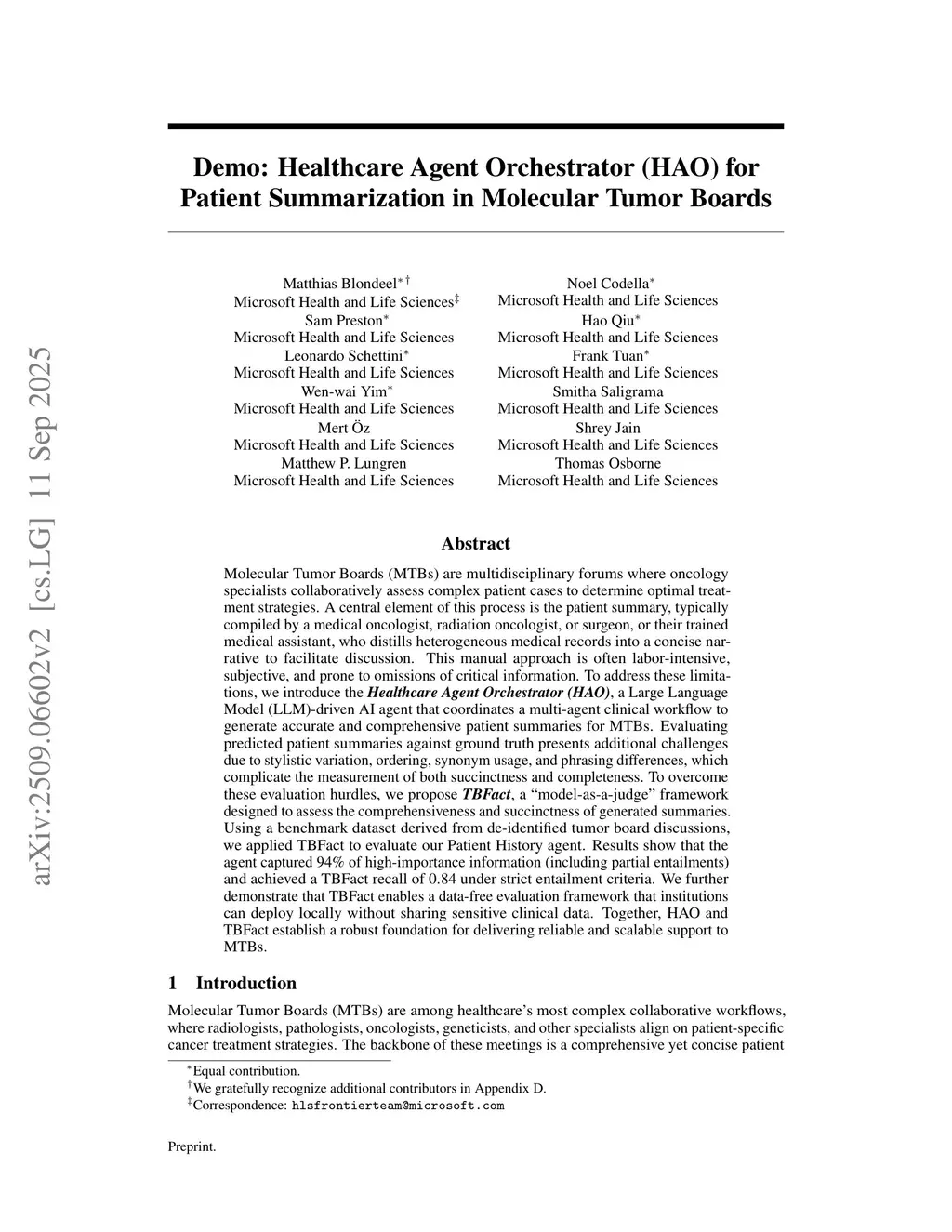 Molecular Tumor Boards (MTBs) are multidisciplinary forums where oncology specialists collaboratively assess complex patient cases to determine optimal treatment strategies. A central element of this process is the patient summary, typically compiled by a medical oncologist, radiation oncologist, or surgeon, or their trained medical assistant, who distills heterogeneous medical records into a concise narrative to facilitate discussion. This manual approach is often labor-intensive, subjective, and prone to omissions of critical information. To address these limitations, we introduce the Healthcare Agent Orchestrator (HAO), a Large Language Model (LLM)-driven AI agent that coordinates a multi-agent clinical workflow to generate accurate and comprehensive patient summaries for MTBs. Evaluating predicted patient summaries against ground truth presents additional challenges due to stylistic variation, ordering, synonym usage, and phrasing differences, which complicate the measurement of both succinctness and completeness. To overcome these evaluation hurdles, we propose TBFact, a ``model-as-a-judge'' framework designed to assess the comprehensiveness and succinctness of generated summaries. Using a benchmark dataset derived from de-identified tumor board discussions, we applied TBFact to evaluate our Patient History agent. Results show that the agent captured 94% of high-importance information (including partial entailments) and achieved a TBFact recall of 0.84 under strict entailment criteria. We further demonstrate that TBFact enables a data-free evaluation framework that institutions can deploy locally without sharing sensitive clinical data. Together, HAO and TBFact establish a robust foundation for delivering reliable and scalable support to MTBs.